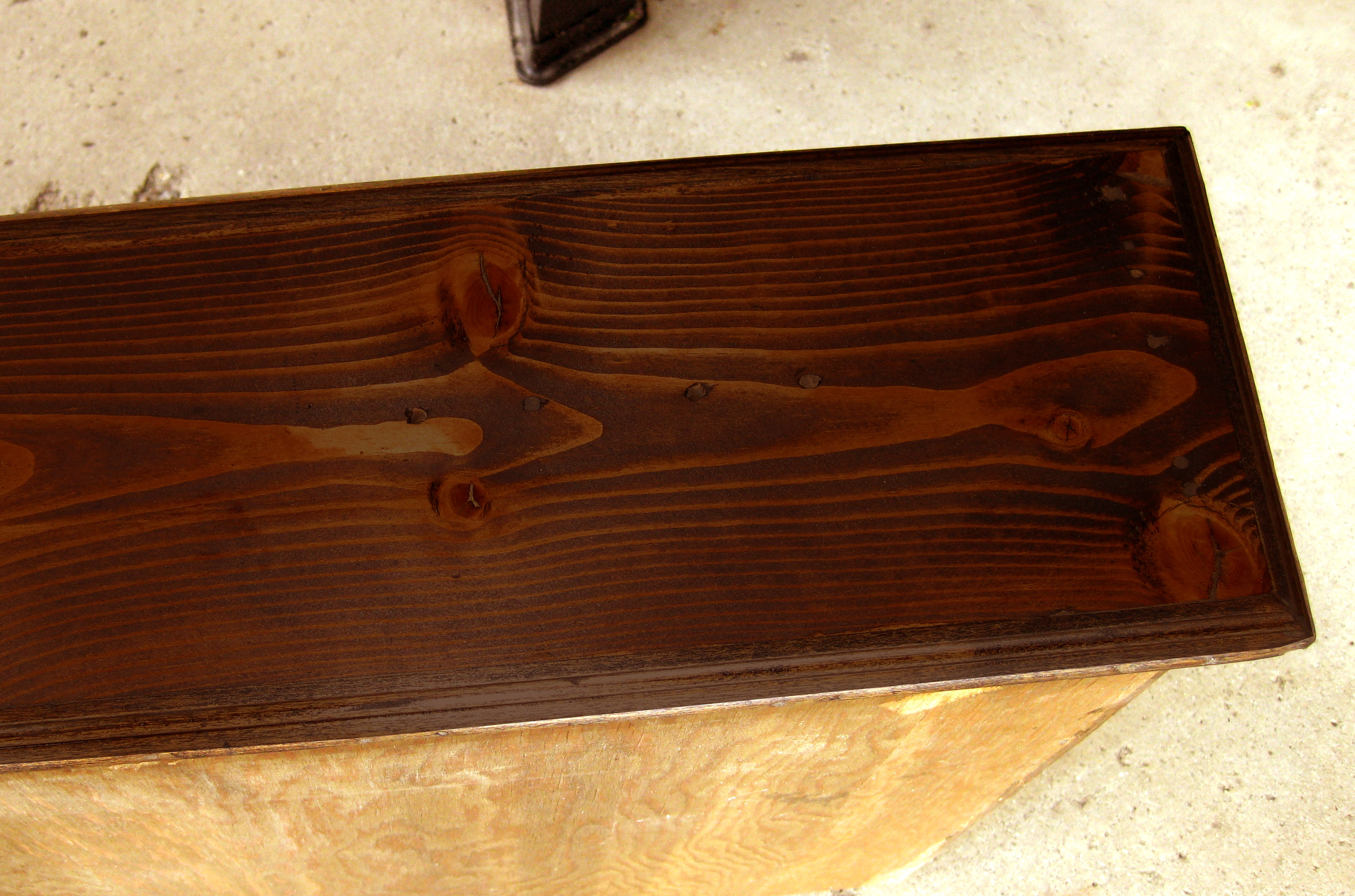 I knew I wanted a rich, dark brown color; I felt a dark stain would not only look good in the room I intend this piece for, but would help even out the grain pattern and minimize the appearance of knots. From past experience, however, I also knew that a dark stain would be a risky challenge as I am fairly certain this cabinet is yellow pine. Yellow pine does not always accept dark stain well or evenly. I tested every stain I already have from previous projects on the underneath side of the cabinet, but none gave me a deep chocolate color. After a quick trip to my local hardware store, I knew one of the two stain colors I purchased would be the one (but which one…?). Off the Minwax interior wood stain chart, I chose both Jacobean 2750 and Ebony 2718. If Jacobean proved uneven or not dark enough, I would trade deep chocolate for dark chocolate. I ventured to first open only the can I thought would be the most likely successful stain. If I was correct, I would have only opened one and could return the unopened can to the store. Much to my satisfaction, Jacobean proved to be very close to the deep chocolate color I had in mind. No need to even open Ebony (although I am really curious to see how it would have looked, I would rather return it and get my $7.99 back).