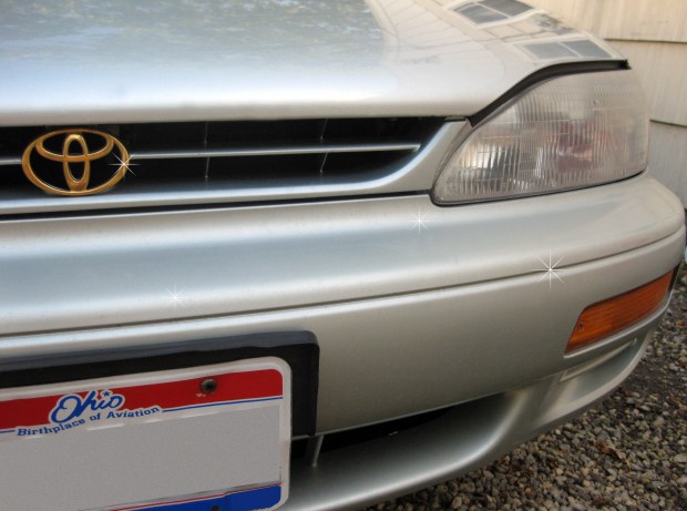 Because the driver side mirror was still the original car color (Silver Leaf, if you are wondering), I wanted to paint it black also. I first cleaned it extremely well to get rid of 15 years of bug residue. It turns out that my cheap dollar store degreaser called Greased Lighting is the best car cleaner I have ever found. While waiting for the mirror to dry, I actually used the degreaser on the entire grill and front bumper! Have you ever seen a cleaner bumper!
