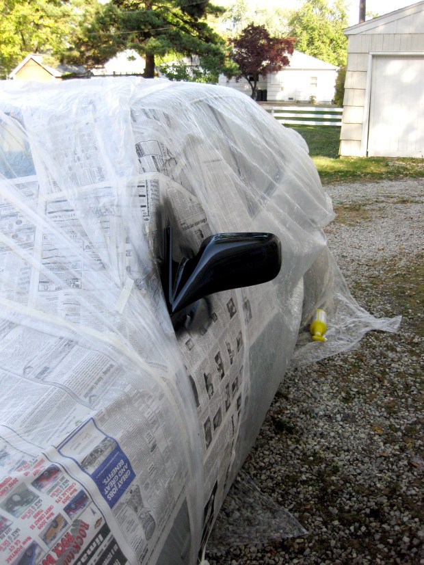 I carefully masked off the entire area around the driver side mirror with masking tape and newspaper, then covered the entire front, top, and side of my car with painter’s plastic sheets for protection against overspray. Now to the painting. I gave each mirror two thin coats of paint, making sure to wipe the mirror free of dust with a soft cloth before each. The results were two mirrors with a deep, even black sheen. As recommended by the friendly associates at the auto parts store, I also purchased an aerosol product called Clear Coat for $6.99. This adds another layer of depth to the paint finish along with even sheen and an added layer of protection. An even layer of clear coat to both mirrors and all I had to do was wait for the finish to dry to reattach them.