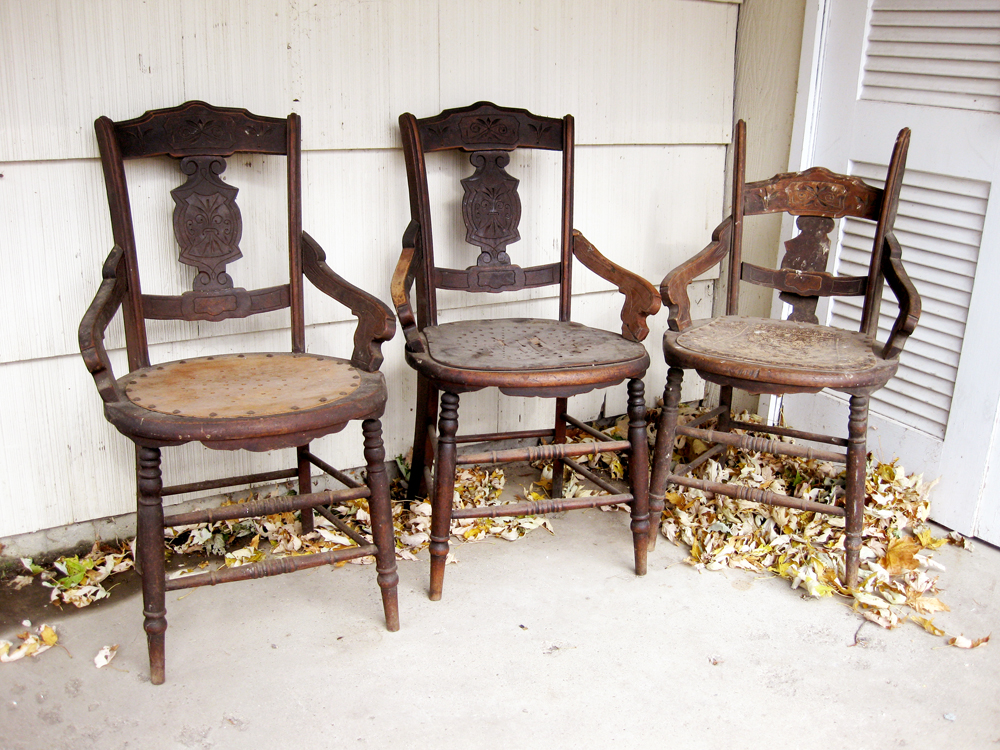 This past Saturday I went to a local estate auction to see what treasures might be up for bid. It turned out that the house was the real treasure, a beautiful big old bungalow with gorgeous woodwork & cabinetry all throughout… but enough drooling, I am not in the market for a house. What I did stay to bid on, however, were the old wooden chairs that were in the backyard.