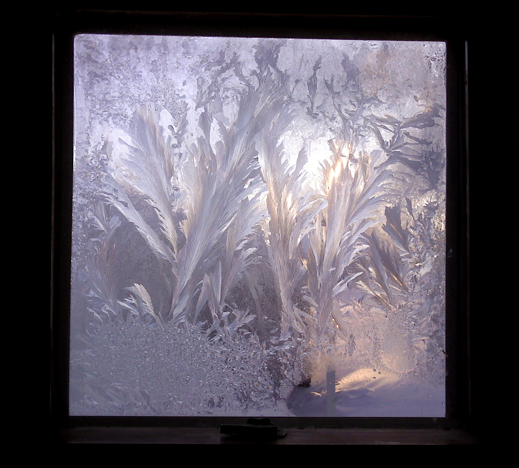 With the frigid weather and temperatures measuring minus 7 F last night (+/- a few degrees depending on which station you watch), the moisture on the old window froze in quite an amazing pattern.