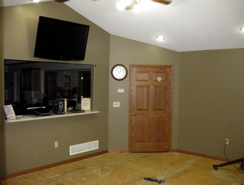 Please ignore the yellow floor; that’s just the plywood sub-floor with what remains of the old carpet glue. I cannot wait to see the room with the new carpet installed, it’s going to be a huge transformation!