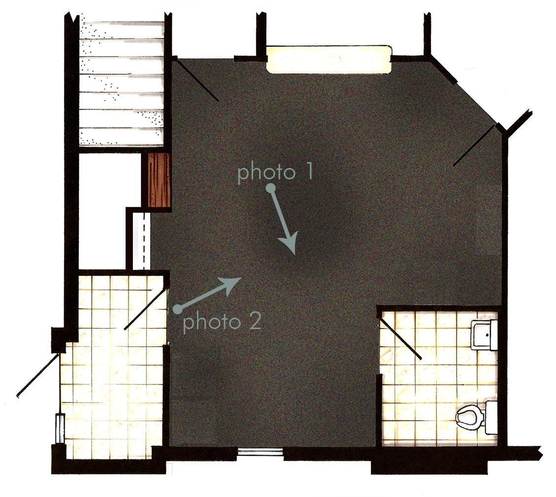 Now for the progress photos. Since revealing my rendered floor plan and design board for the space (which you can see in this post), the painting contractor has been in and out, and now the flooring contractor is at his work. In fact, he was preparing to lay the new carpet just as I was taking these progress photos.