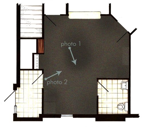 It has been a few weeks now since I have acquired the title freelance designer, and I am getting to like the sound of it. I first mentioned that I had taken on a freelance client in this post over a month ago, but I didn’t reveal the client or explain the project until this post a few weeks ago. In that amount of time, so much has happened. The space is the entrance, lobby and public restroom of a local chiropractic office. The chiropractors and staff had me take a look at their space and see what could be done to make it look and feel more welcoming for patients. Here is a basic floor plan of the space.