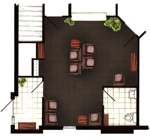 As the rooms were originally painted a consistent off-white, the rich green and beige paint I selected will instantly warm the entire space. The paint colors are Sherwin Williams 6143, Basket Beige, and 6151, Quiver Tan. The carpet selected is for the main lobby, while the ceramic tile will line the bottom half of the bathroom walls. The most notable feature of the room will be the slate wall fountain on the east wall, becoming the focal point and adding the soothing sound of trickling water. Last but not least, adding a few plants (unfortunately silk because of the very limited natural lighting) will complement the dark wood tones of the furniture and bring life and brighter color into the space.