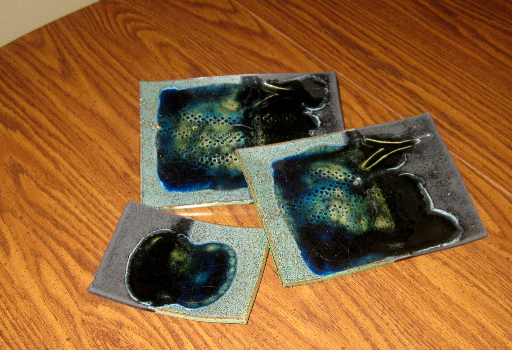 A set of 4 plates (only 2 in the photograph) and small platter, made for sushi and wasabi. I enjoy a good sushi outing every now and then, but wouldn’t make something like that at home. Maybe for entertaining, for appetizers or hors d’oeuvres. I just saw these handmade plates and knew I had to have them. I love the two tone turquoise-gray background with multiple textures, the thickness of the glazing in some areas (lead-free so they are food safe), and the crazed surface of the plates.