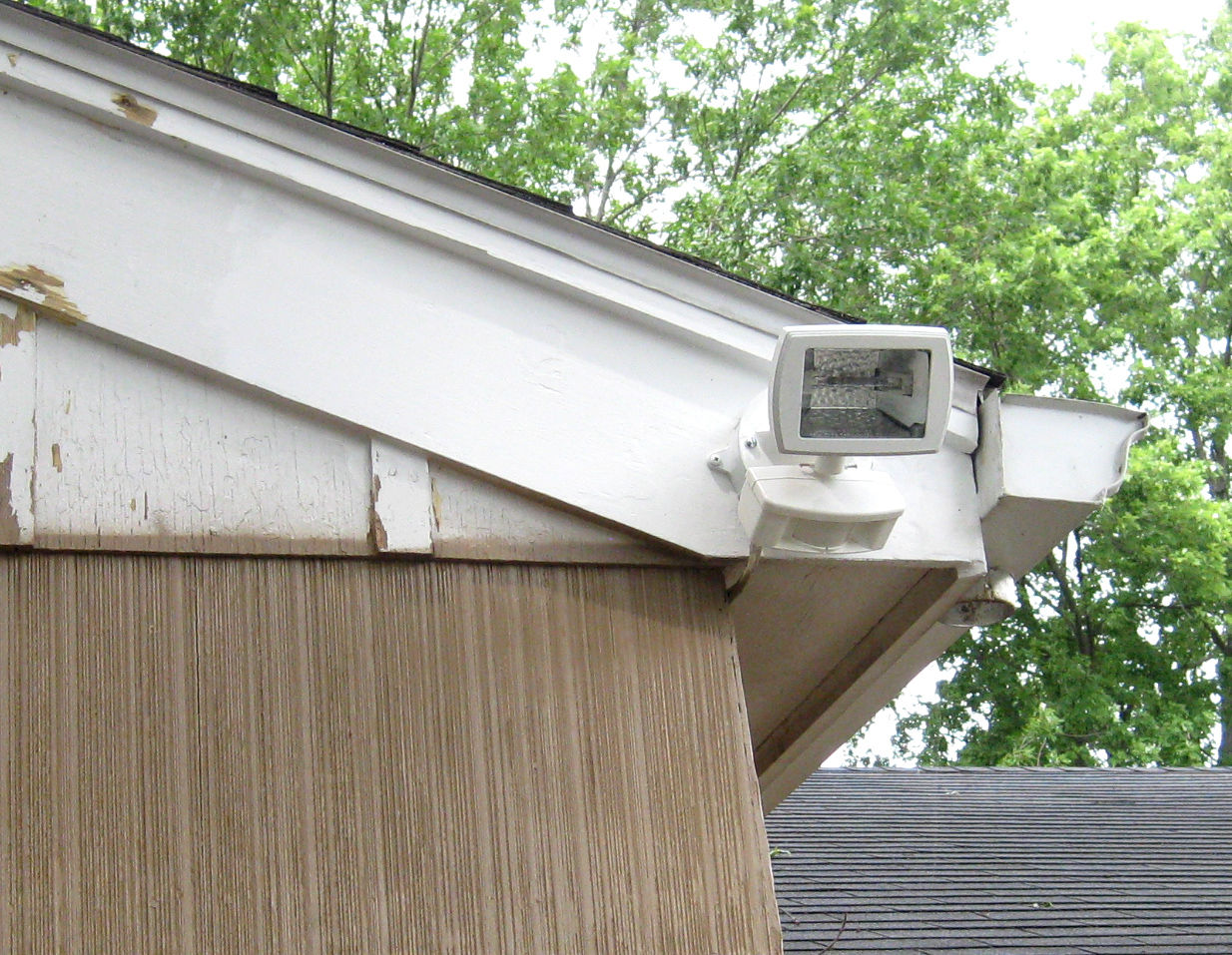 This is the light fixture we chose from the home store. I wanted something white to blend in with the white trim board, but something fairly petit looking. Security floodlights often look huge and alien in shape with their multi-directional cone heads. I liked this one because it felt simple and compact, but would still be powerful enough to light the small space between the house and garage. It’s 150 watts and an Energy Star Qualified product; it’s motion sensor doesn’t turn the light on during the daylight hours.