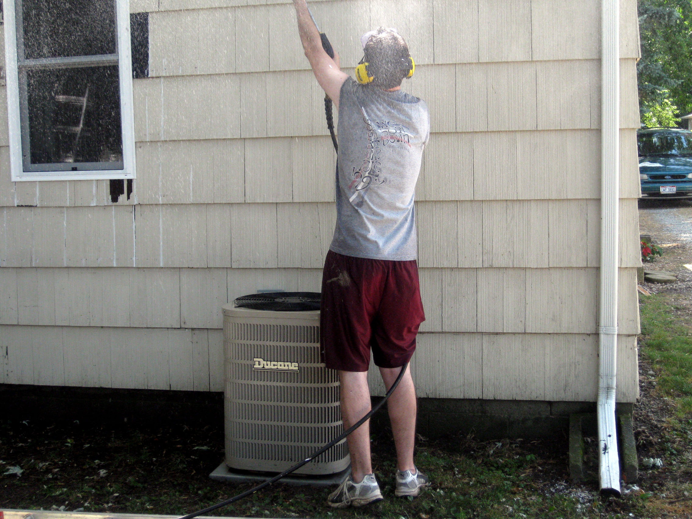 Last weekend I forewarned that I was about to embark on a pressure washing adventure. I am here blogging to you to say it was successful. No falling off ladders, no broken arms or busted windows. We were thankful for a warm sunshiny day and cranked up the pressure washer. Be cautioned, if you use a pressure washer you will get wet. Like, soaking wet. I recommend high school chemistry class goggles and machine gun operator ear protection. Clothes are optional. I am wearing clothes in these photos only because I am extremely pale skinned and didn’t want the camera operator to get blinded in case of a camera flash. Oh yeah, and because I have neighbors.