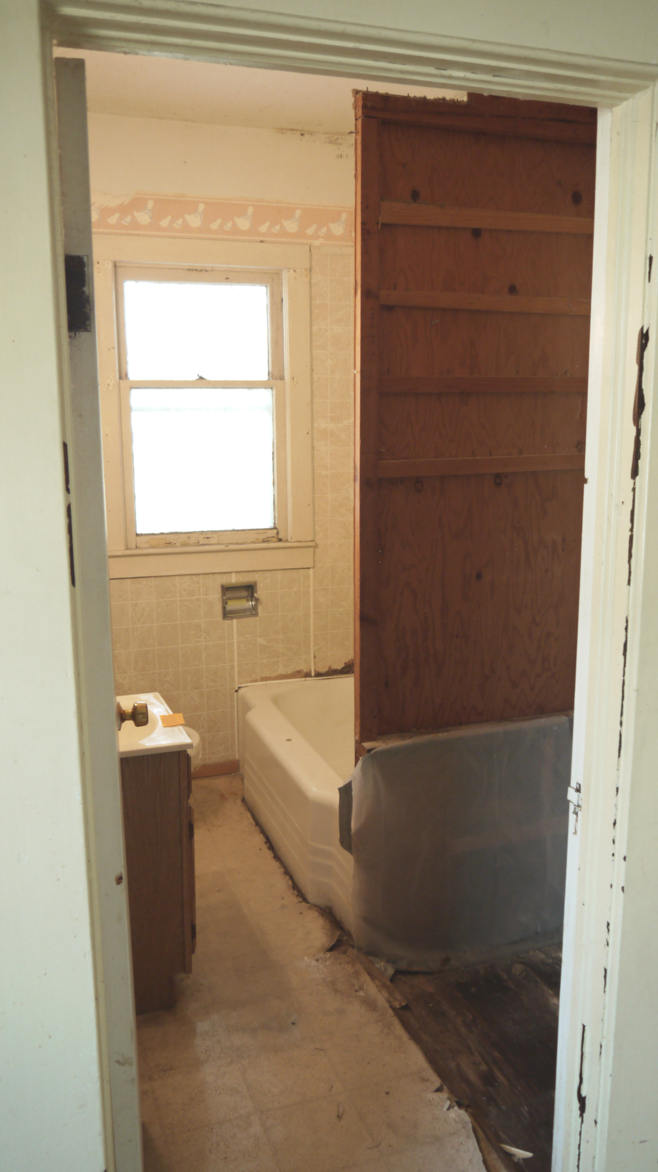 The nice large bathroom window floods the room with light. And that’s about where the amenities end. The walls are covered in bad paneling, the goose-themed wallpaper border is glaring, and the linoleum is peeling up all around the tub from water leaking.