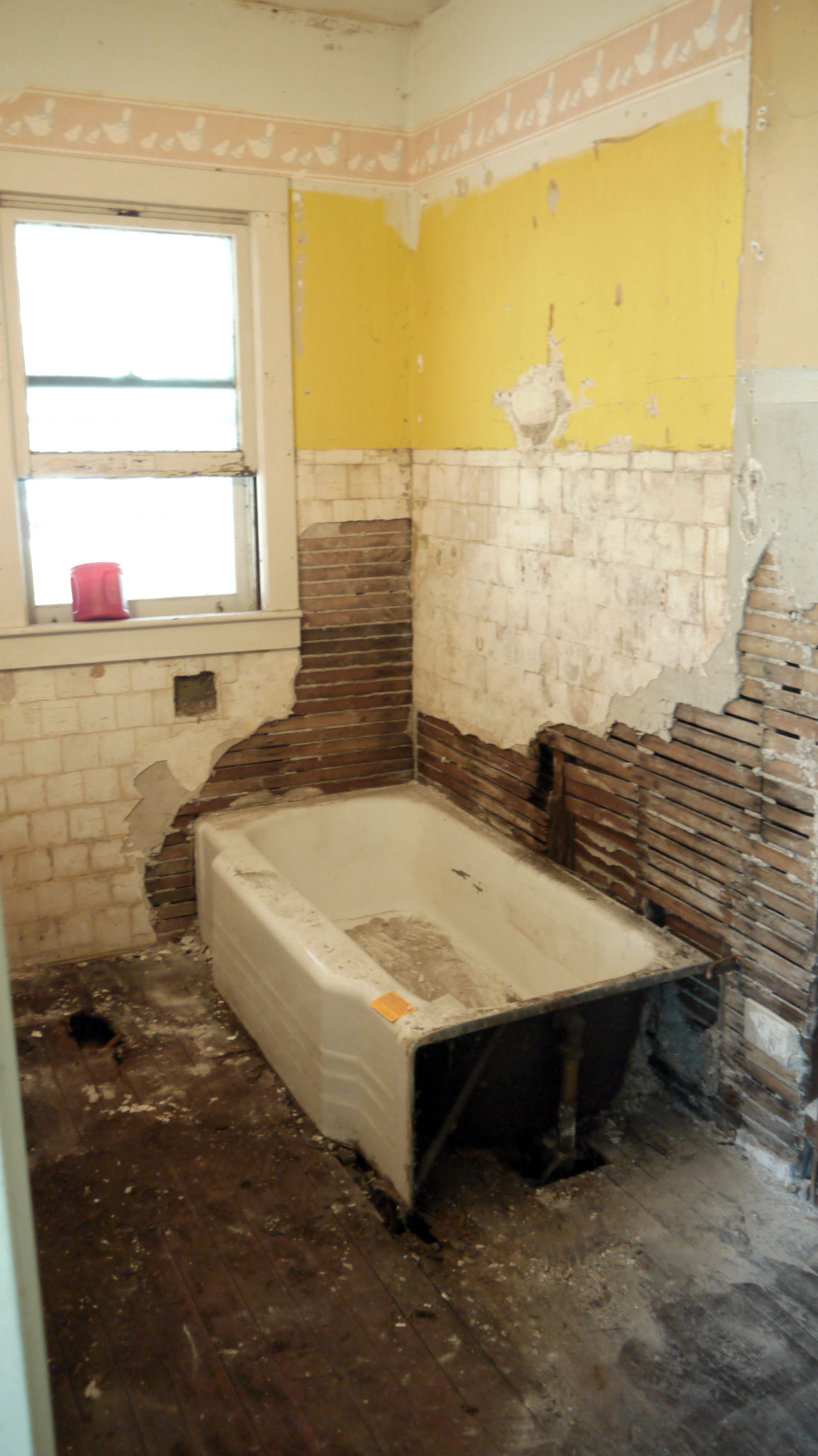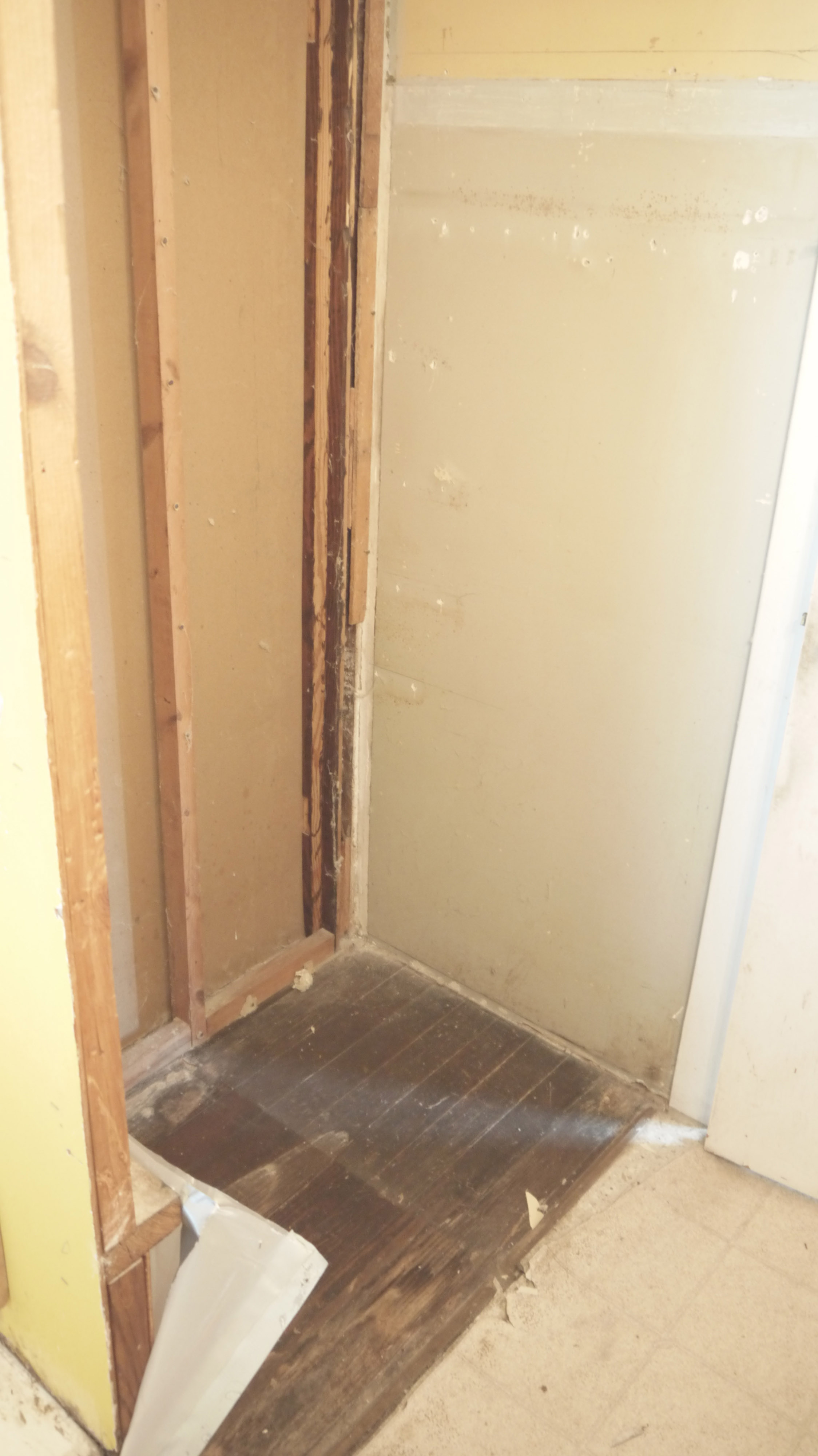 I can’t figure out what this area was. It is immediately to the right once inside the doorway. The linoleum has been tore up, exposing the original wood floor. The open wall looks like it used to be a doorway into one of the bedrooms. Part of me thinks there could have been a stand up shower here; its big enough, but there is no sign of plumbing, either supply or drain. So I figure this must have been a closet, and that would explain the door frame still in the wall. Perhaps the previous owner removed the closet in a first step to renovating the bath.