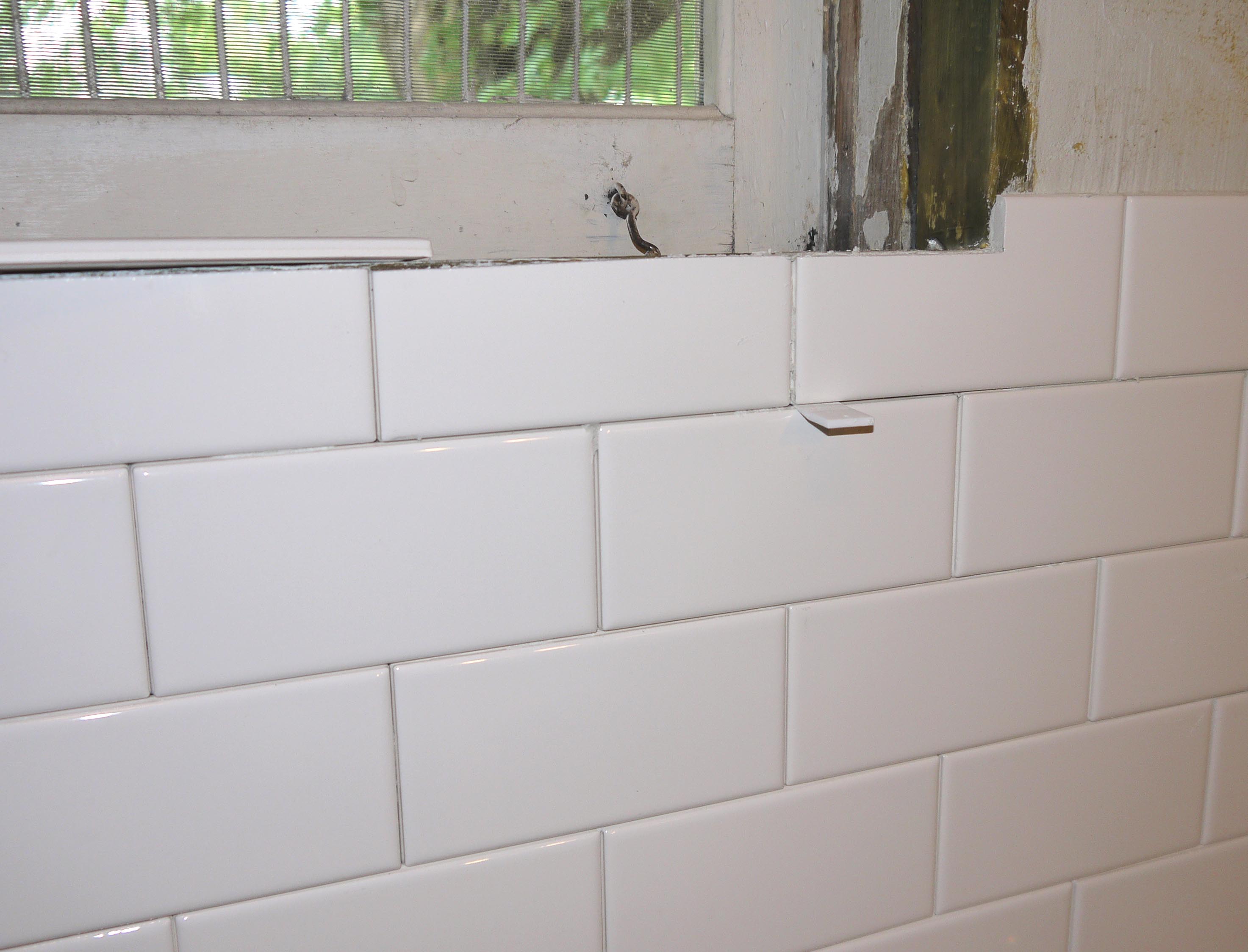 The wood trim attached to the wall provided a straight edge to begin tiling this wall, level with the ledge of the tub. This way, each row would meet in the corner and the grout lines would be aligned.