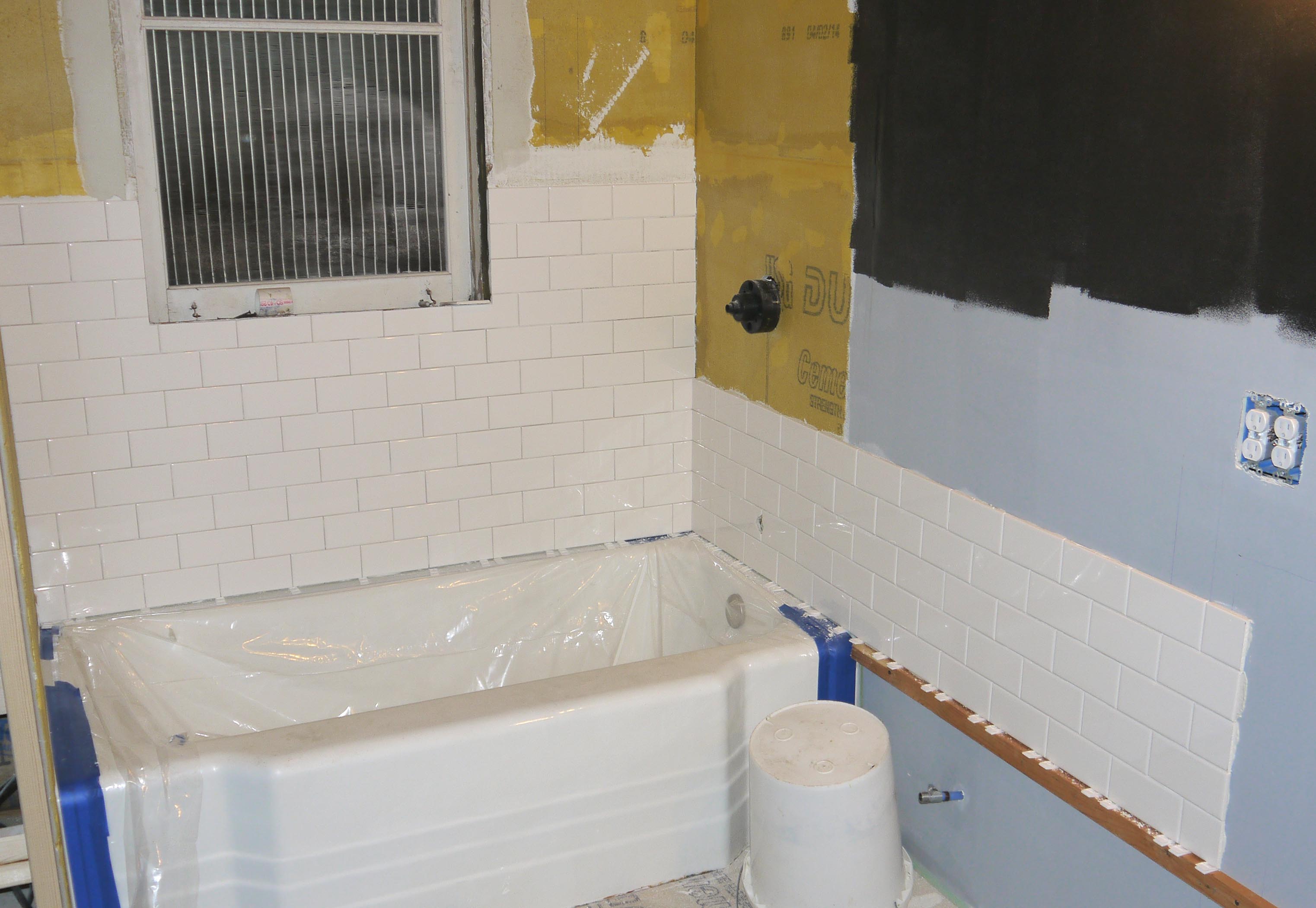 I started with the tub side wall, under and around the window. Rather than get fancy with the corners, I simply tiled the side wall all the way to the corner and then butted each row of the front and back wall up against the corner once again. Once its all grouted, it will just be a straight line in the corner rather than a weave that a professional might make by doing one row at a time and alternating each row.