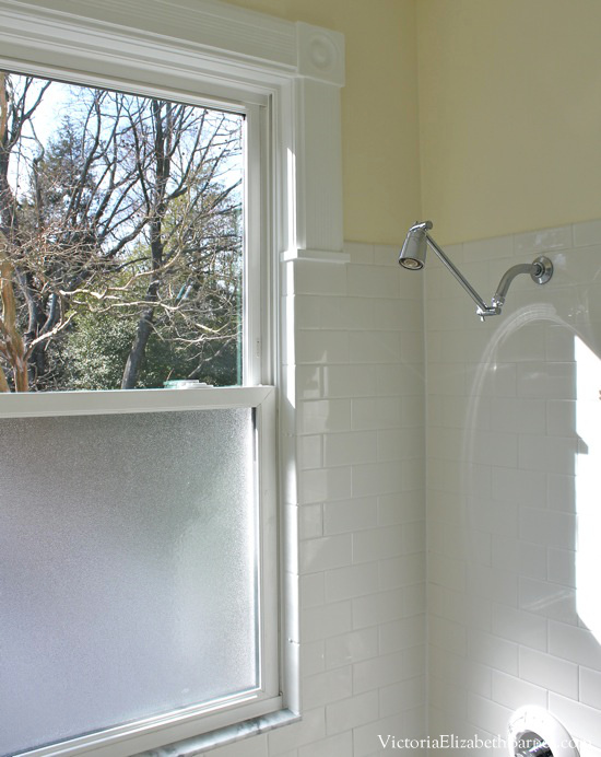 Now with the tub moved, I tiled up about 3/4 the height of the window. I found this photo early on of another bathroom with a window in the rub/shower area, and decided I liked the look: