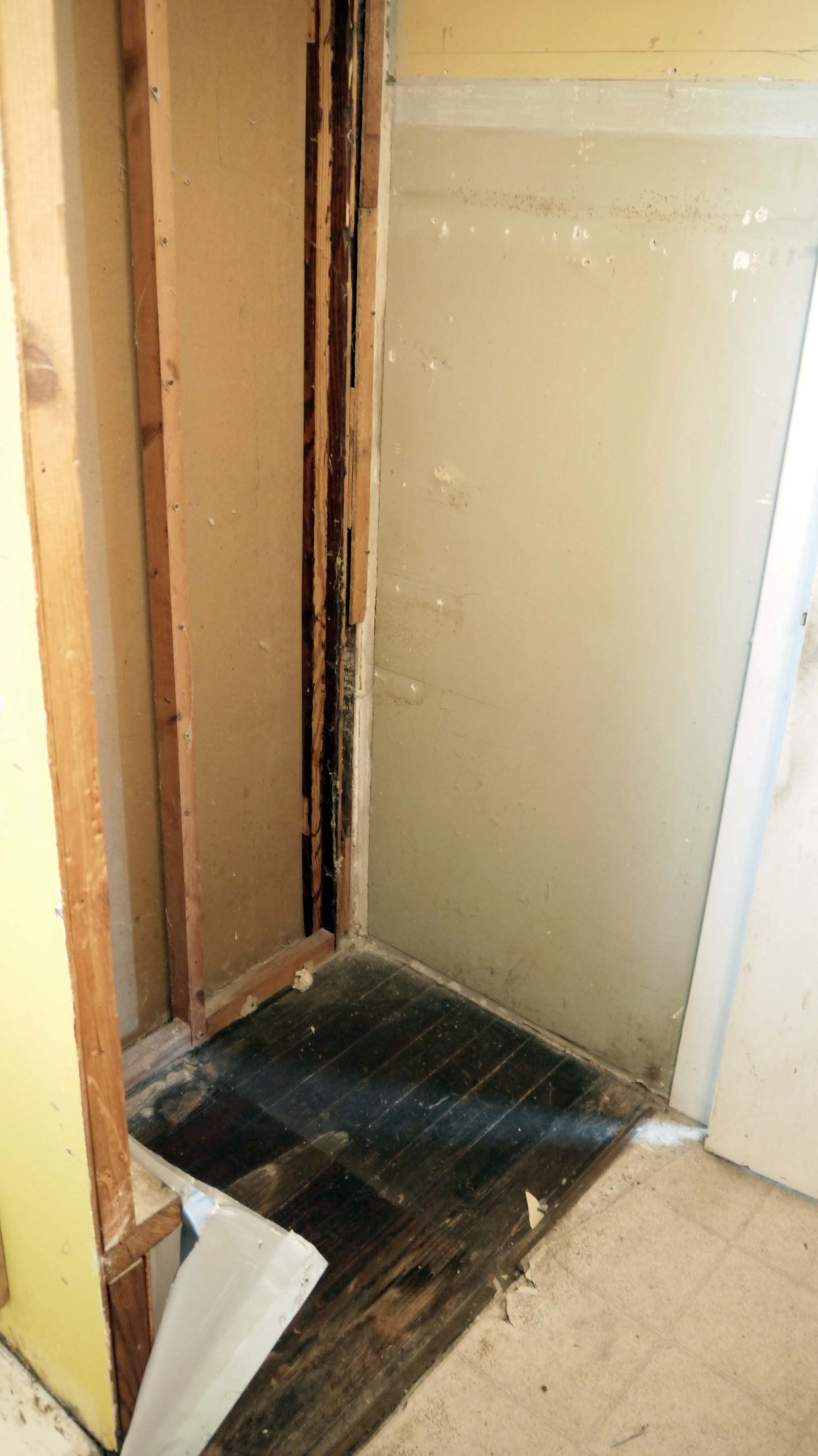 I don’t think the wardrobe was originally here. Firstly, the baseboard in the room runs behind the wardrobe. Secondly, inside the wardrobe there was part of an inside door latch screwed into the floor – but it was against the back wall. And lastly, the wardrobe is almost the exact size of the opening that was unfinished in the bathroom when I first bought the house: