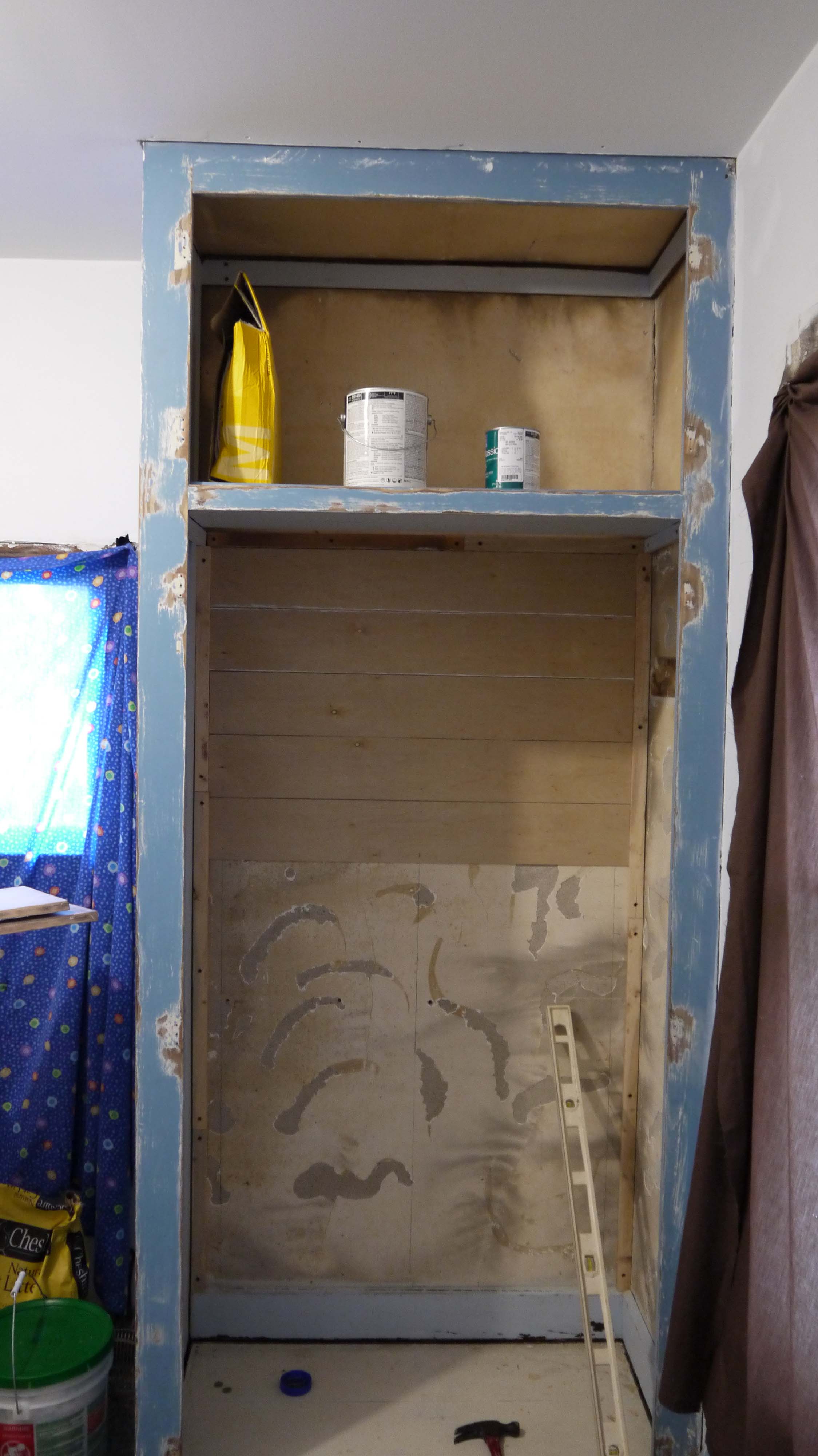 So I removed the doors (I didn’t like the hinges anyways), and tore out the inside closet organizer too. The previous owner had glued melamine panels to each of the walls & ceiling inside, but I tore it out also – it wasn’t cut well, leaving unfinished corners throughout. Once removed, it revealed the plaster walls not in such great shape – and the adhesive tore the finish plaster off with it. So I beefed up the cabinet itself by screwing wood supports along each of the corners into the walls, and then nailing the frame of the cabinet to these cleats.