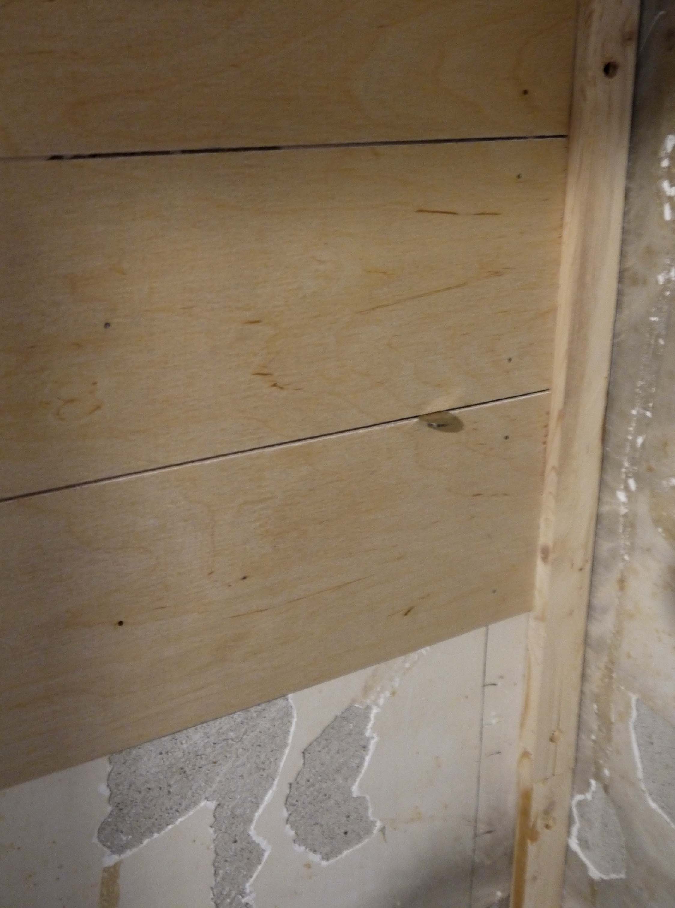 Rather than repair the plaster inside (not worth the time in my opinion), I took 2 sheets of underlayment and ripped them into 6″ planks and nailed them inside the closet to make it look like a wood lined closet. I used nickels as spacers to keep the planks in line.