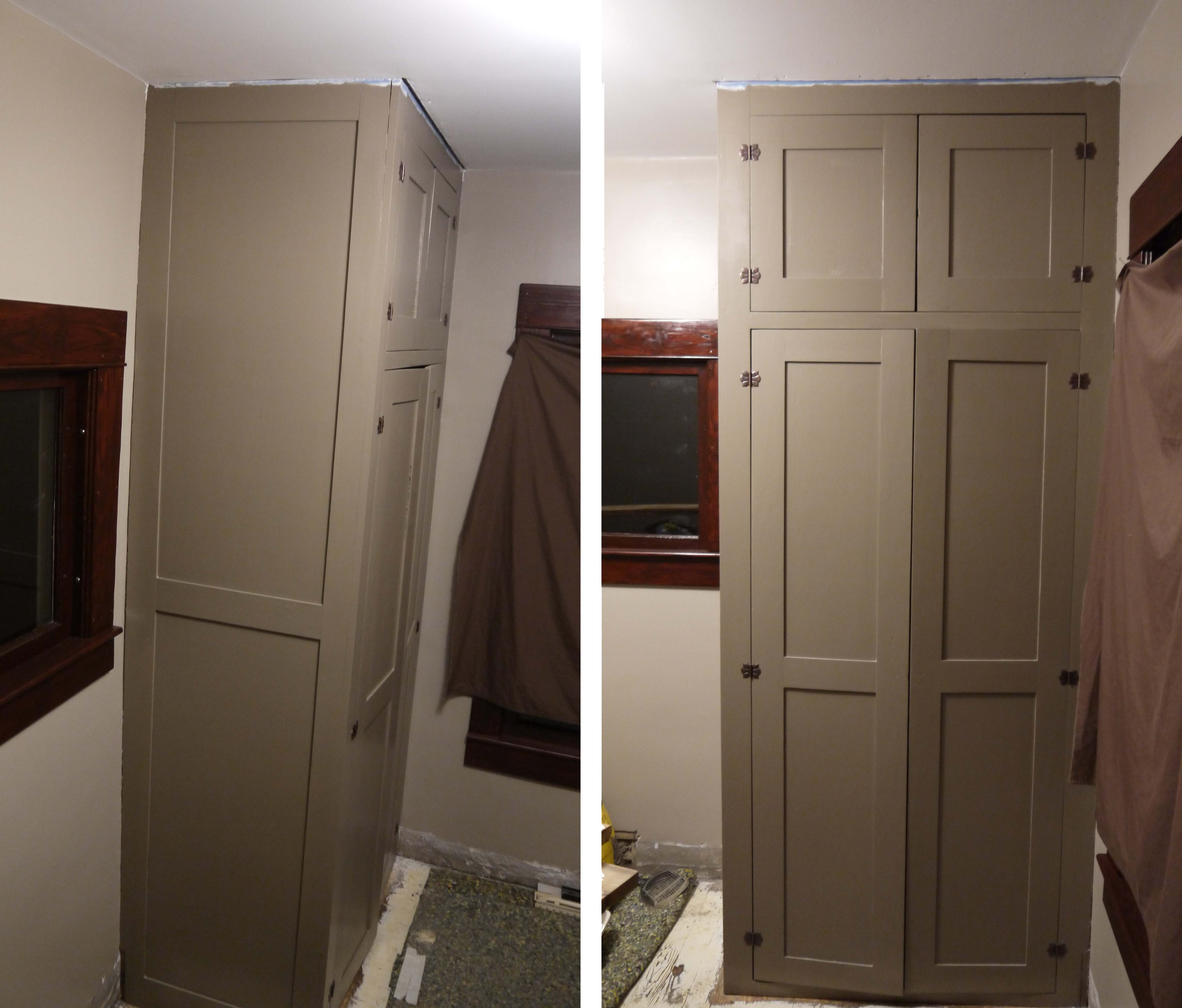 I’m even thinking of building some custom interior dividers to allow for 2 hanger bars, and maybe a few low shelves for shoes. But that’s not priority. To finish it off, I need to make a few pieces of cove crown molding for where it meets the ceiling, and also find some nice cabinet handles. But otherwise, I’m really happy with how it turned out.