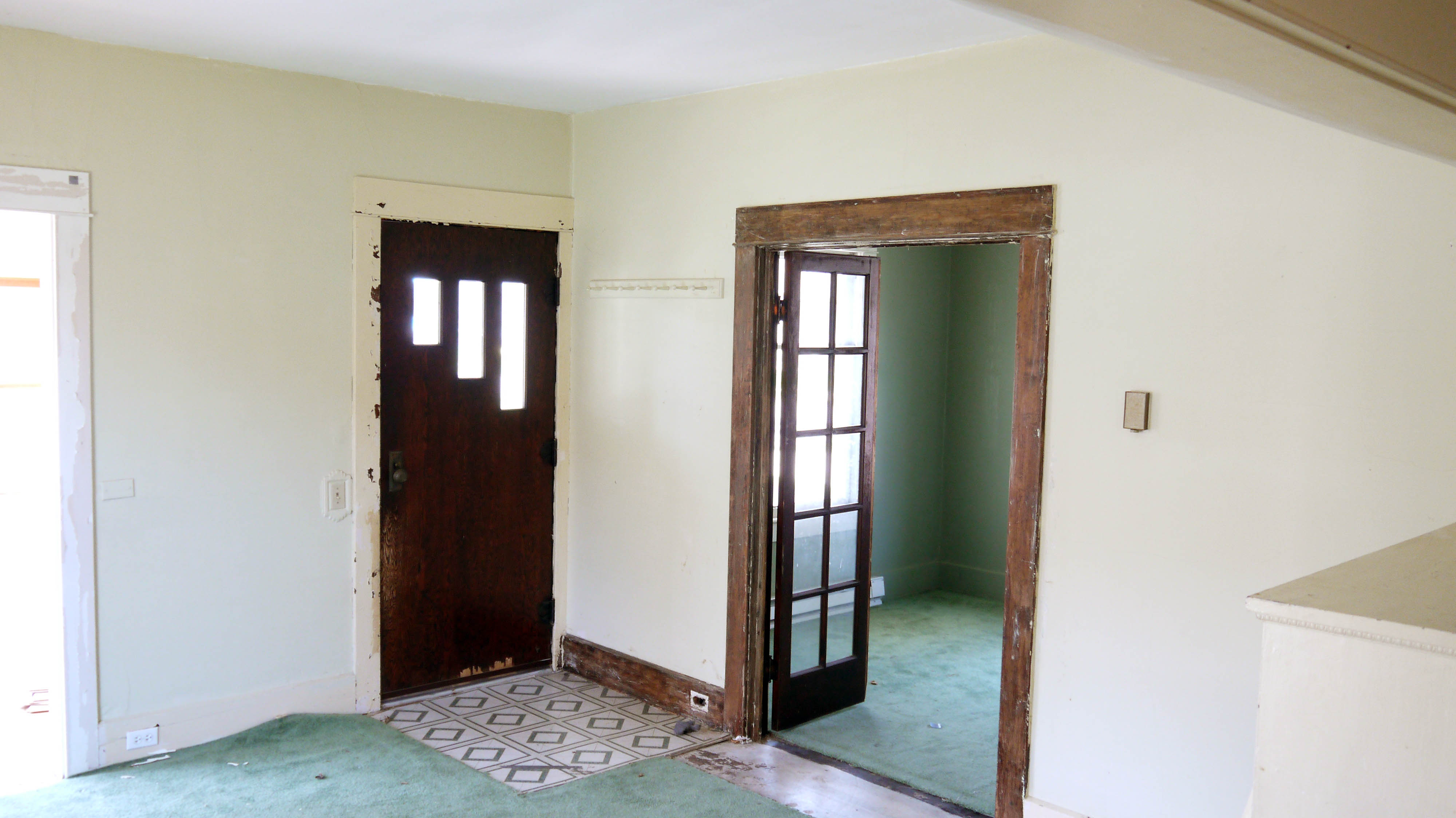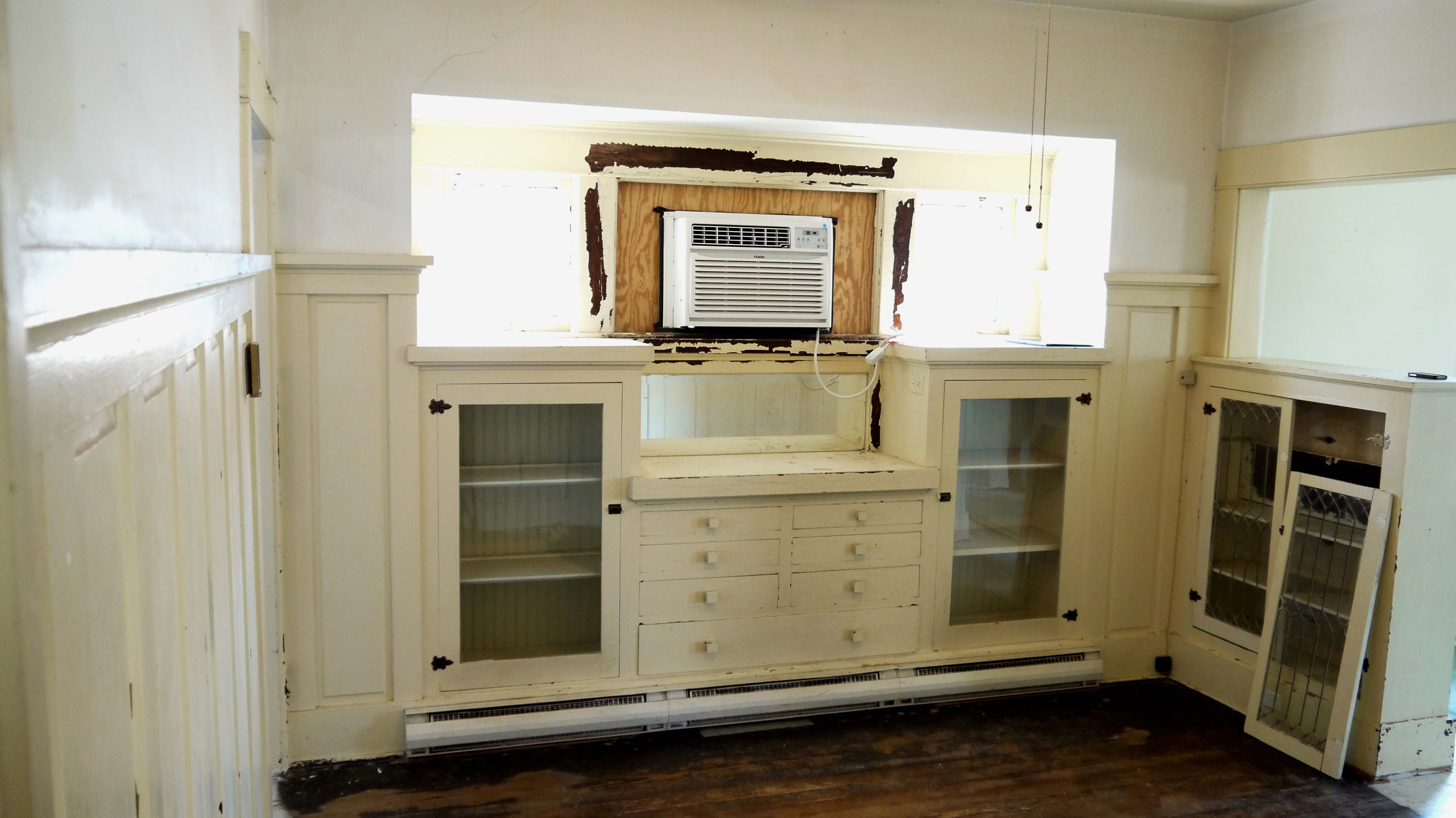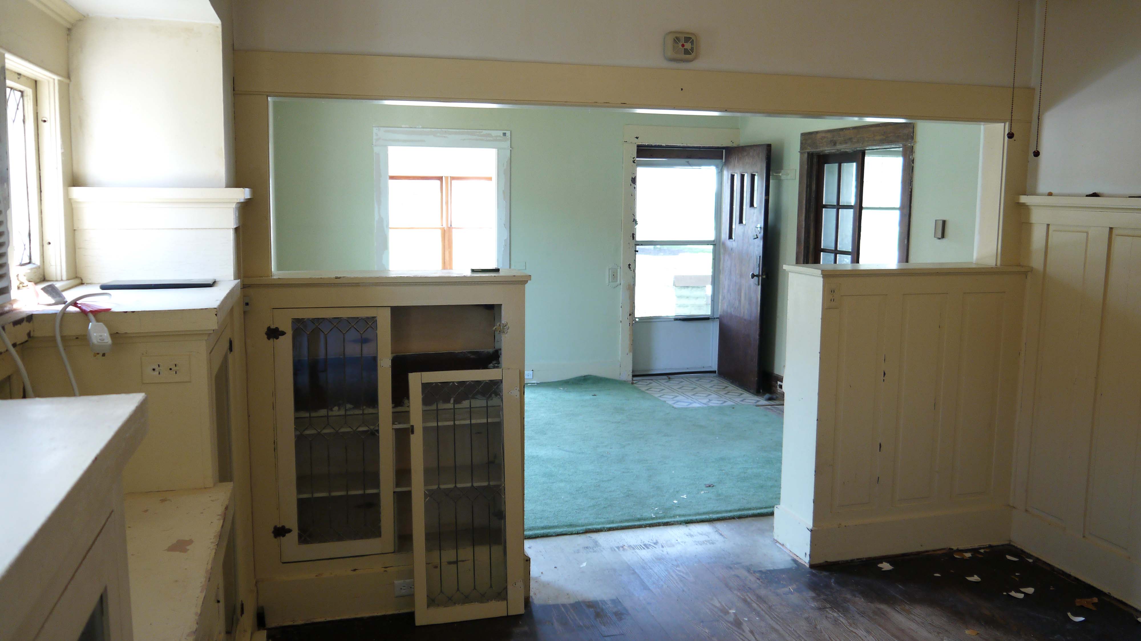 Back through the living area, we walk into the dining room. This is the room that sold me on the house. The cabinets, paneled walls, and built-in buffet are just screaming for me to strip them of their layers of paint. And now a glimpse of the wood floors too, which are in every room either under carpet or linoleum. And we also get a sense of how beautiful the woodwork is under the dingy carpet and paint.