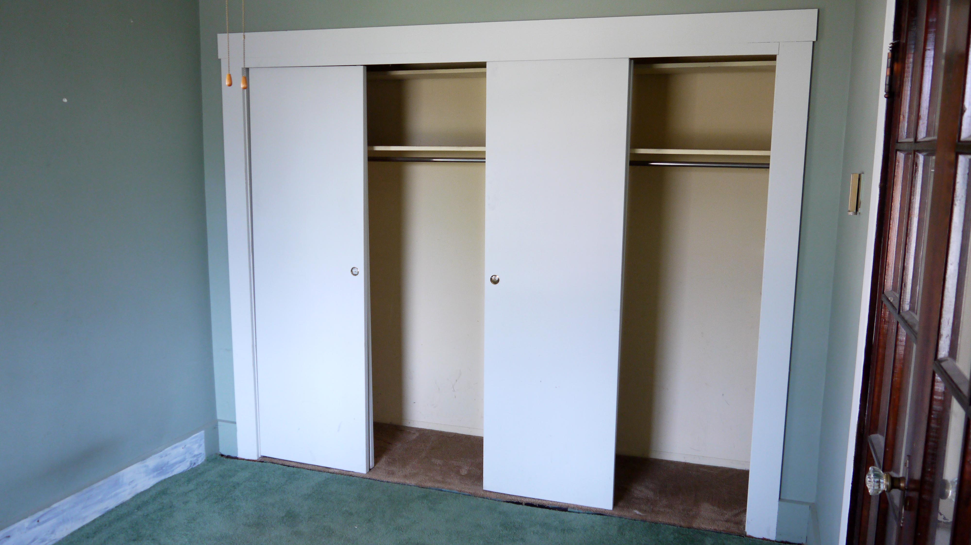 This bedroom does have a nice double wide closet. The trim suggests that it was added later, as they are just flat painted boards, along with the sliding hollow doors. I have a great idea to make this closet look more original, using salvaged trim and doors (that are nearly a perfect match!) from a commercial building that was demolished earlier this winter.