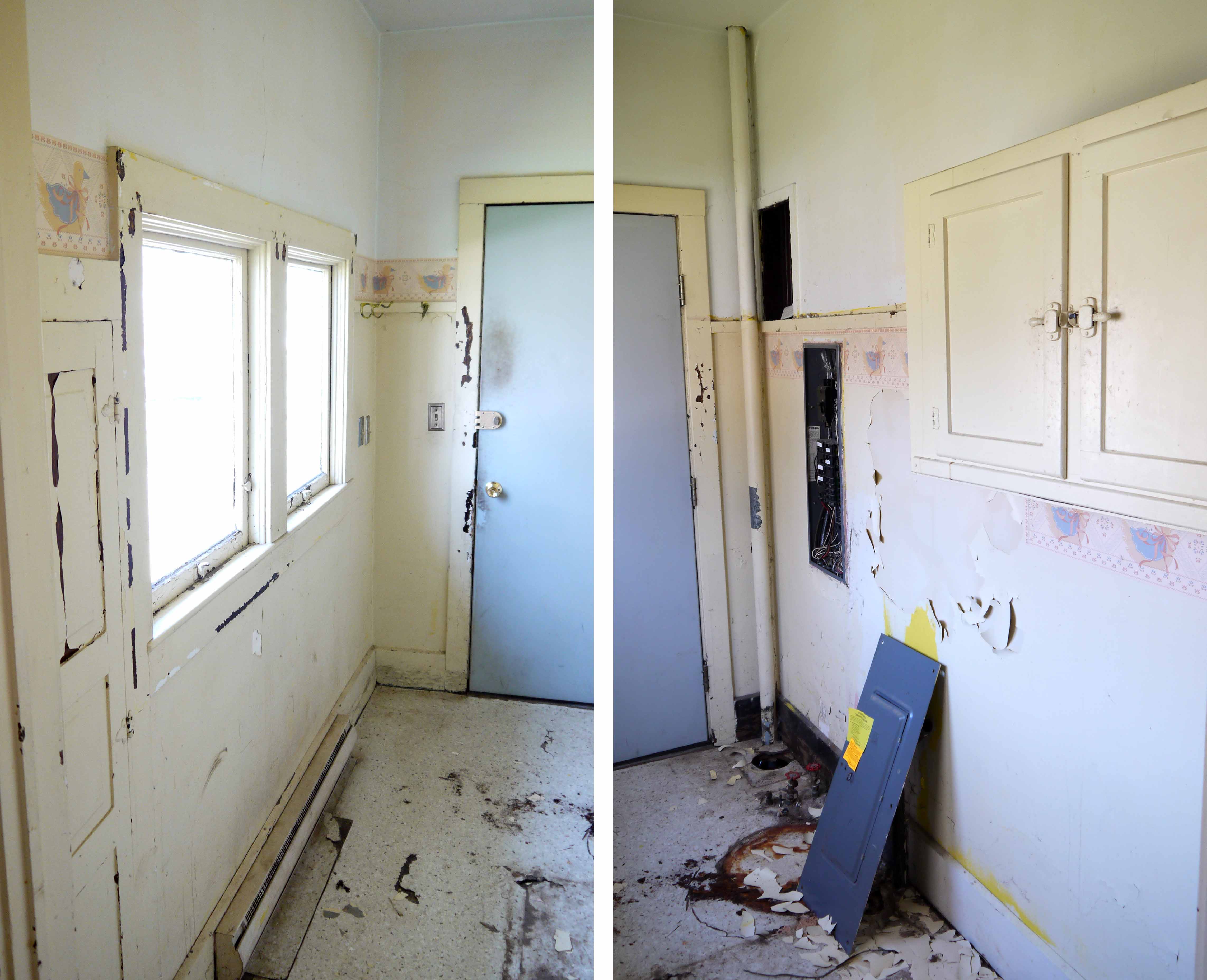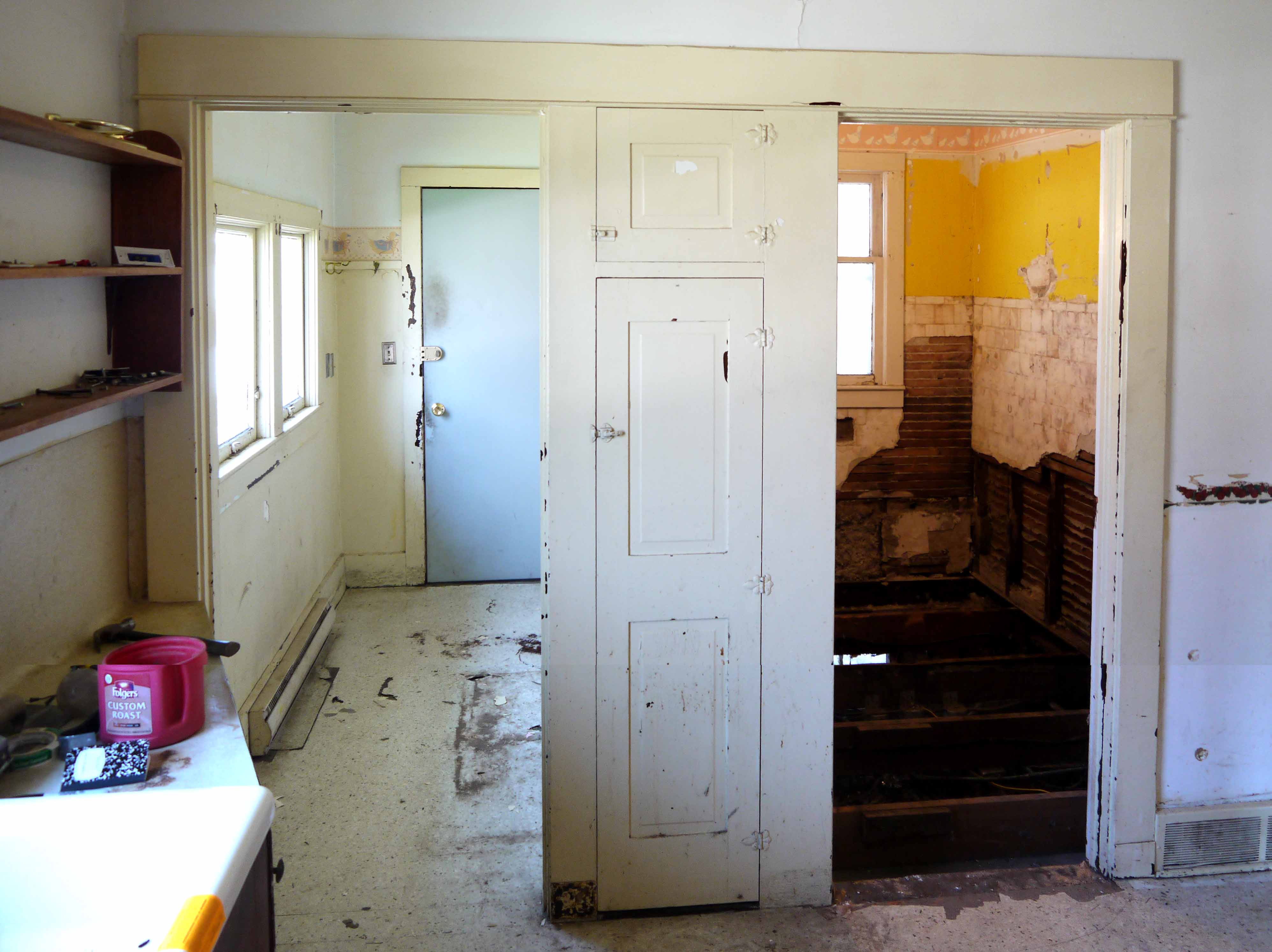 I can’t figure out what this area was. It is immediately to the right once inside the doorway. The linoleum has been tore up, exposing the original wood floor. The open wall looks like it used to be a doorway into one of the bedrooms. Part of me thinks there could have been a stand up shower here; its big enough, but there is no sign of plumbing, either supply or drain. So I figure this must have been a closet, and that would explain the door frame still in the wall. Perhaps the previous owner removed the closet in a first step to renovating the bath.