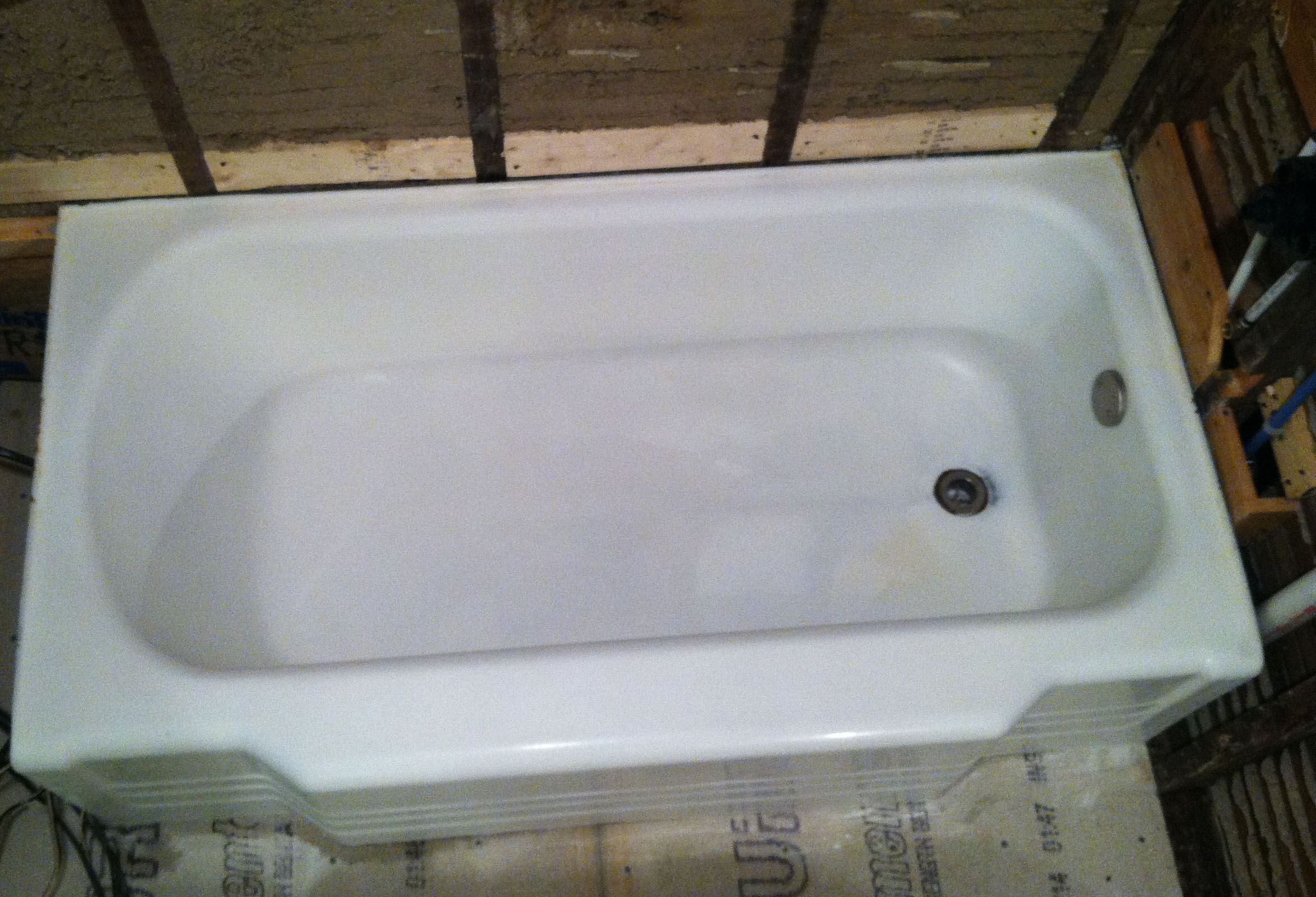 I added lots of cross-supports between the studs and the wall behind. Although it was very strong on it’s own, this will be a tiled shower wall, and I don’t want any flexing to crack tiles or cause them to break off. The 1×4 sections between the studs are flush to the front of the framing studs. Just like the ones you can see along the top edge of the tub, these were a recommendation from a how-to video I found very informative on YouTube (Seriously, TileMasterGA: I have learned so much from his many videos documenting each thorough step of a quality and long-lasting bathroom renovation). These boards he recommended are to provide additional support to secure the wallboard as strong as possible, minimizing flexing. I just used scrap boards for these pieces. I also put them at the height where 2 sections of wall board will meet, to make sure the joint has this strong support as well.