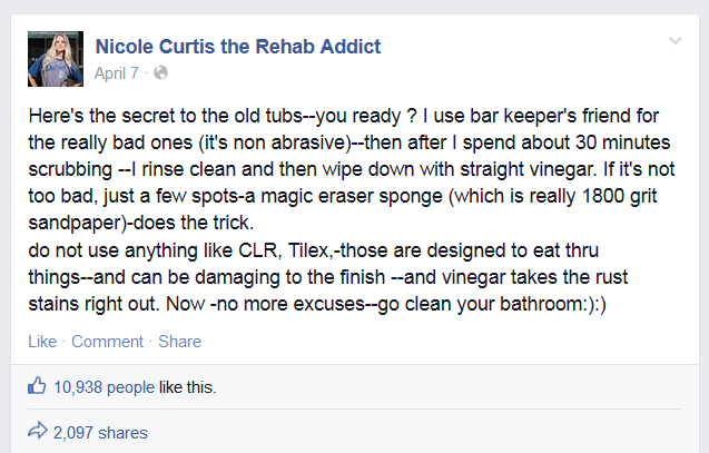 Not quite a luxury soaking tub, eh? Nicole recommends Mr Clean Magic Eraser for light staining and scuffing. For heavy stains and gunk, she claims her secret is Bar Keeper’s Friend.