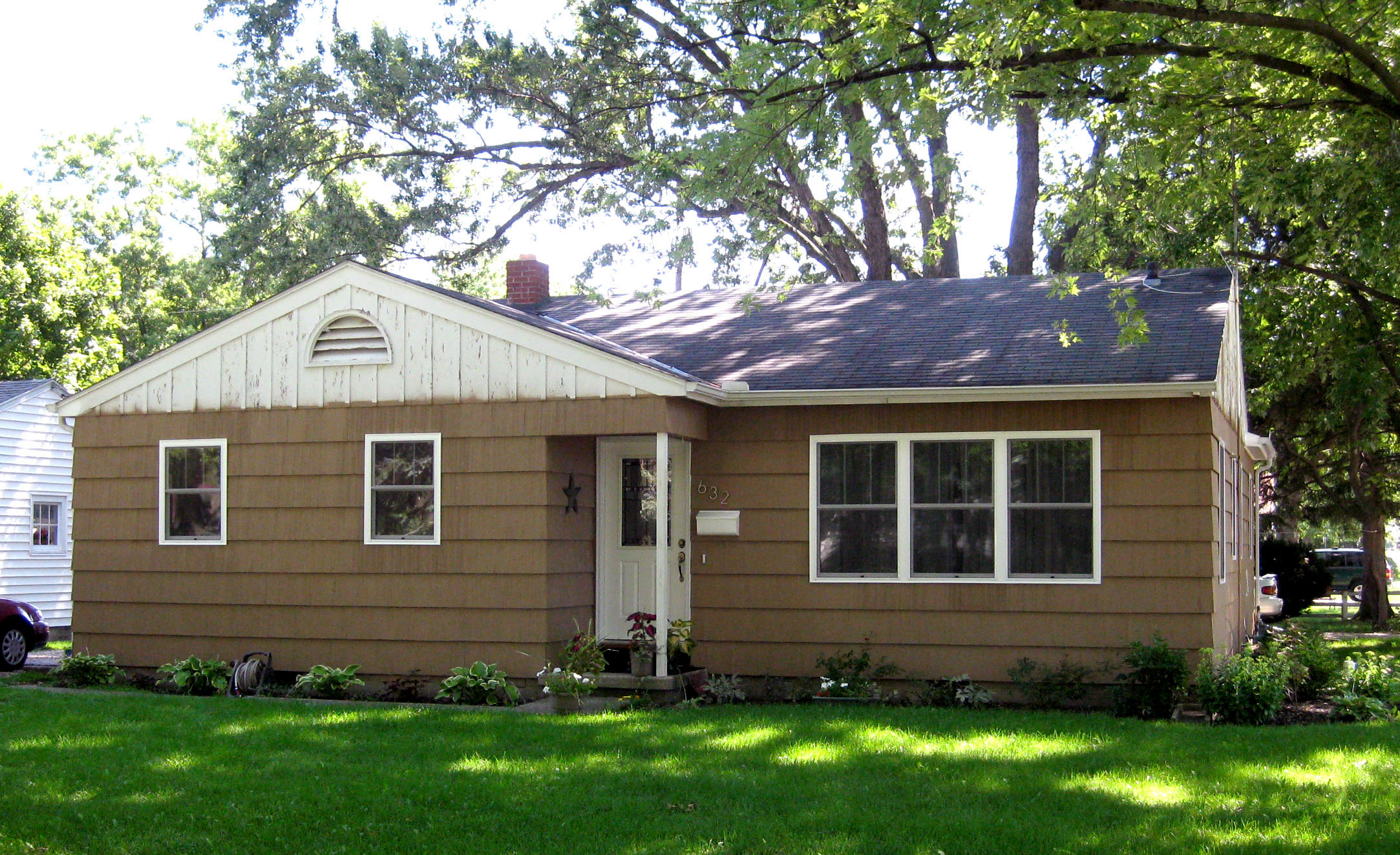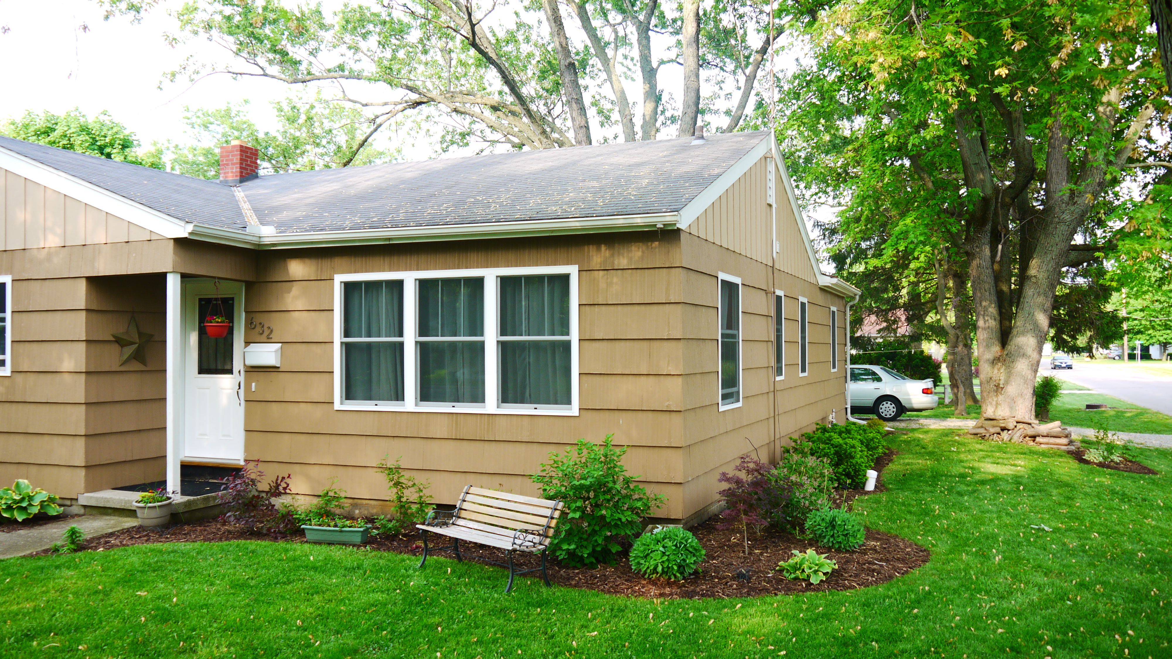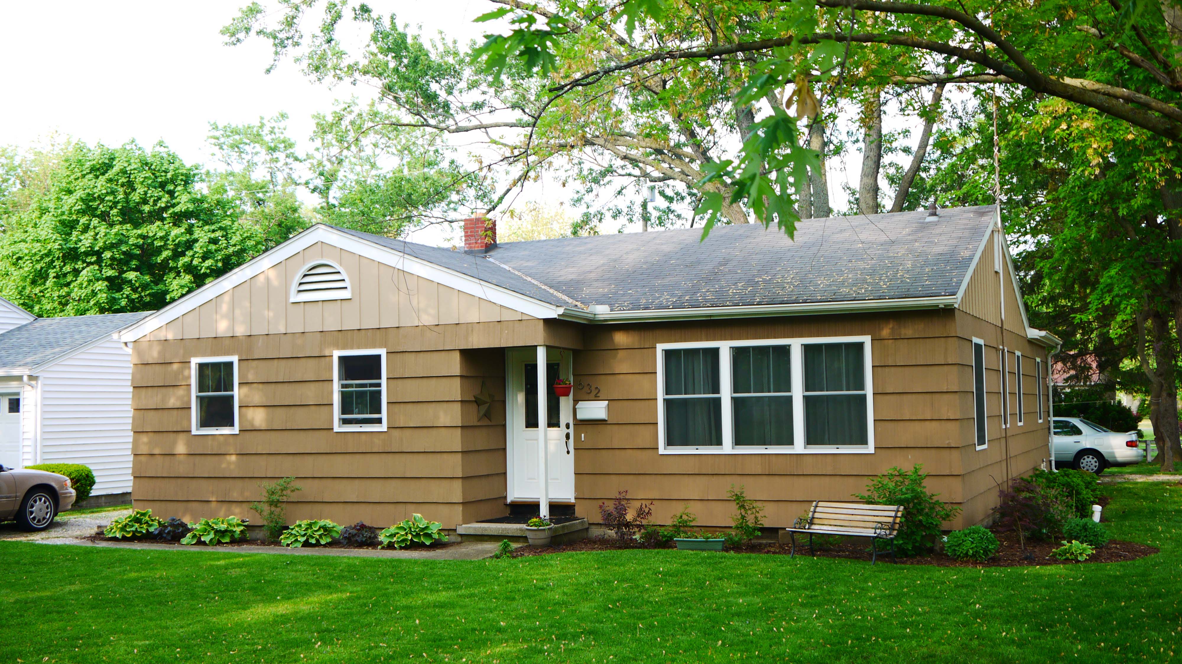 Below is the completely untouched “before” picture. Other than maybe a few plants and the park bench, this is how the house looked before I started working at all. Complete with rotting windows, vintage door, and fading bland paint job.