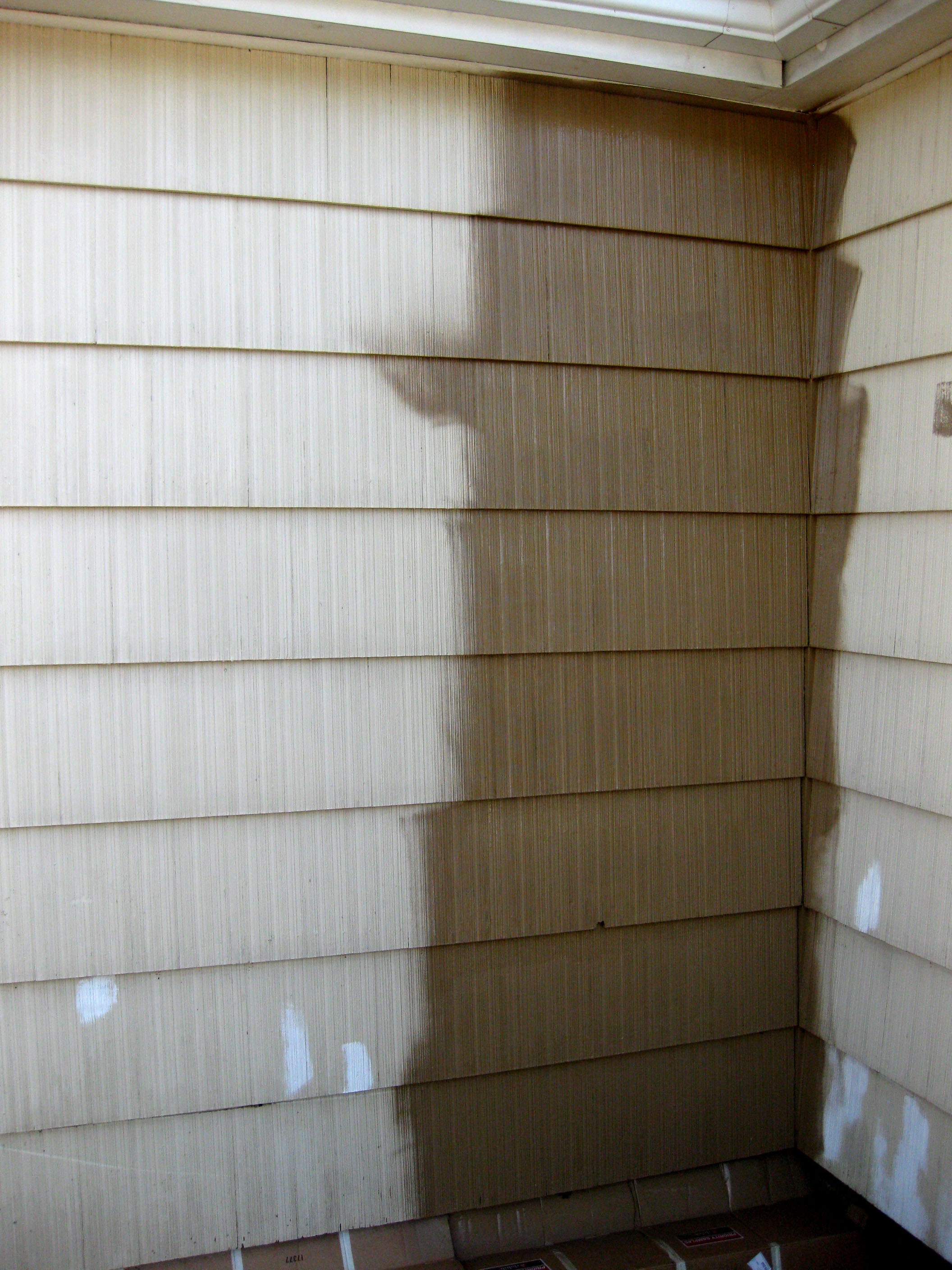 Onto the good stuff. We were fully geared up and prepared to paint the house with 2 brushes in each hand. And that is exactly how we primed the entire exterior with Zinsser Peel Stop clear binding sealer. It was like painting with milk; very thin and watery, and dried to a very slight sheen over the surface of the shingles. We wondered if it was even doing any good until we had to clean a few dried drips off of a window frame. Oh my goodness was it nearly impossible to clean off once dry! So if it stuck that well to new shiny vinyl window frames, I figure it must have been a good product!