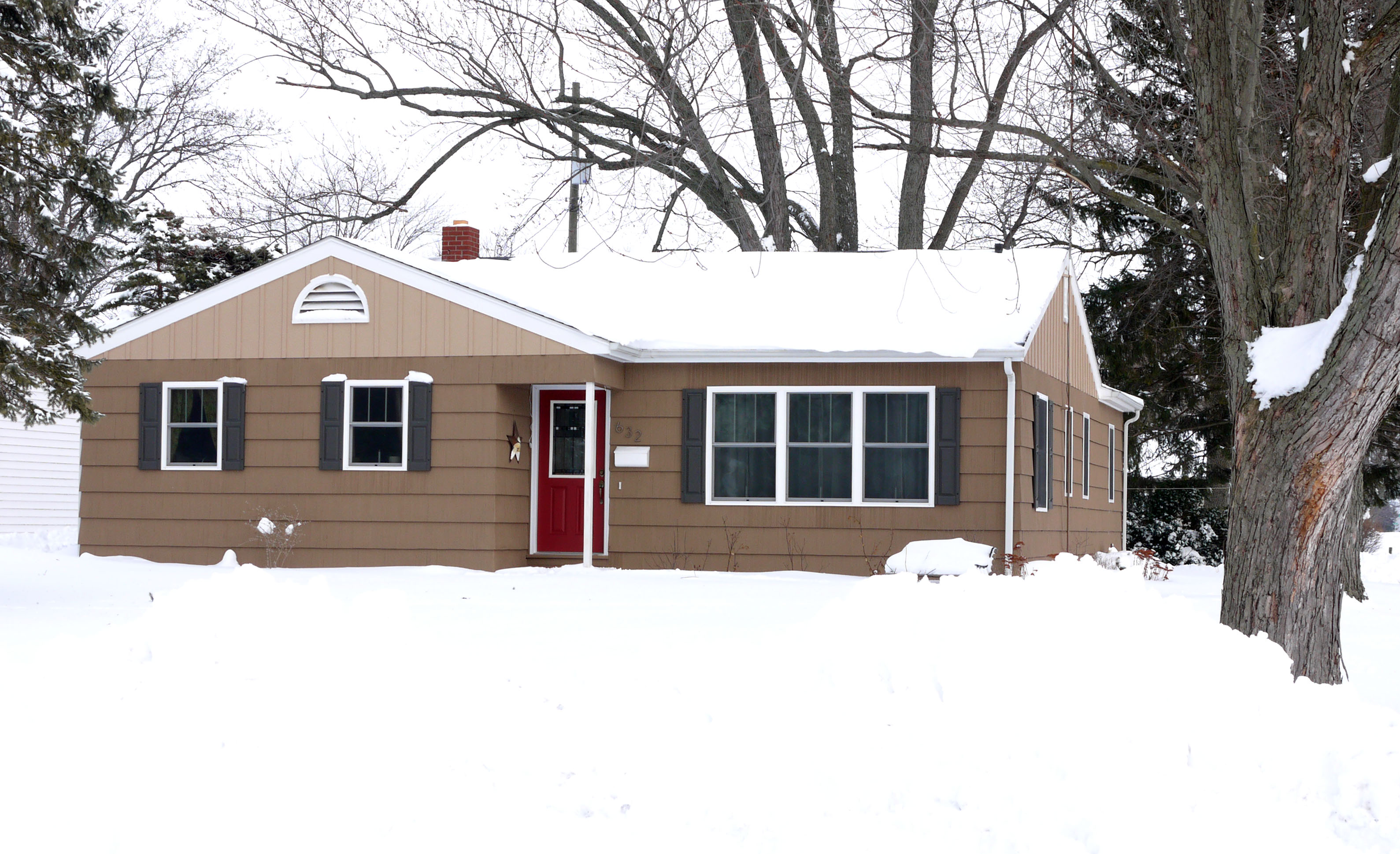 And here is the house (with shutters) earlier this winter, about mid January.The shutters are actually a color called Urbane Bronze (Sherwin Williams), but it is a strange color. Some days they look brown, some days they look black, and in the photo above they look blue gray. Since we didn’t replace the dark gray roof, I thought a gray/brown shutter color would help tie in the dark roof and brown paint scheme. And I think it accomplished that.