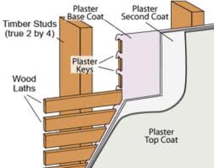 As this photo shows, the plaster that squeezes through the lath boards when applied are called keys. While hammering, I can hear these falling down into the wall so I know they are breaking lose. Then begin a hole in the plaster with the claw end of the hammer.