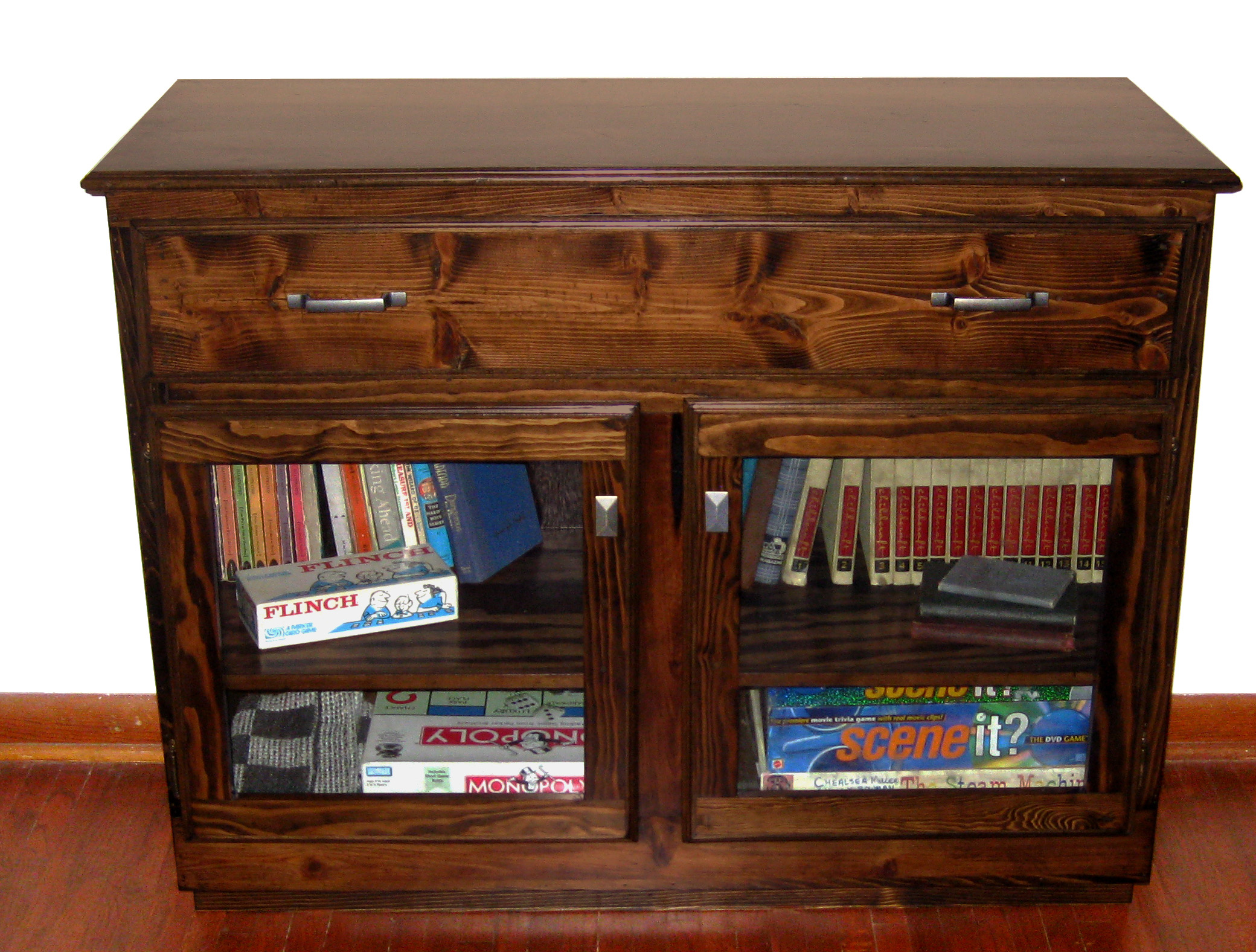 All in all, here is the completed cabinet!. I waited to make sure the poly had cured completely before bringing it into the house to keep the smell and evaporating chemicals outside. Far to anxious to wait (and because I already had things I wanted to store in it), the pictures below give away how my I intend to use the cabinet. Perhaps later I will photograph it again once all the Christmas decorations are up!