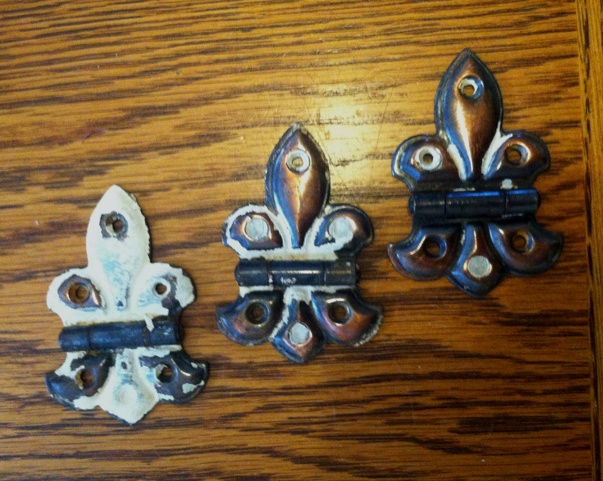 The hardware was caked with paint. This picture is actually after the first soaking and scrub with a brass bristle brush. The secret for removing paint off of metal – hinges, knobs, handles – is a good soaking for several hours in very hot water with a touch of baking soda. An old crock pot works really well for this, set it and forget it.