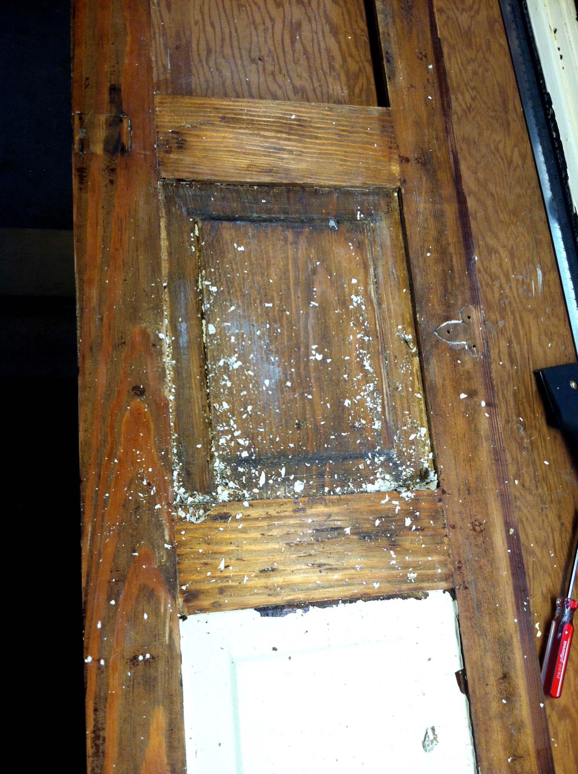 Well, maybe. I’d like to think it would’ve been the same amount of work. But a new door would have been “fake.” It wouldn’t have the gauge near the top hinge, where perhaps the guy who installed the door slipped with his screwdriver. Or the chip on the middle raised panel, from when a little kid running to play outside hit the door with the toy in his hand. And I’d have to have found a couple special boards with wormholes dotting one side, like on the inside of the door frame. Gauged, chipped, and wormholes? Yes. Flat, smooth, perfect; no. Once again, it’s something I like to call “character.”