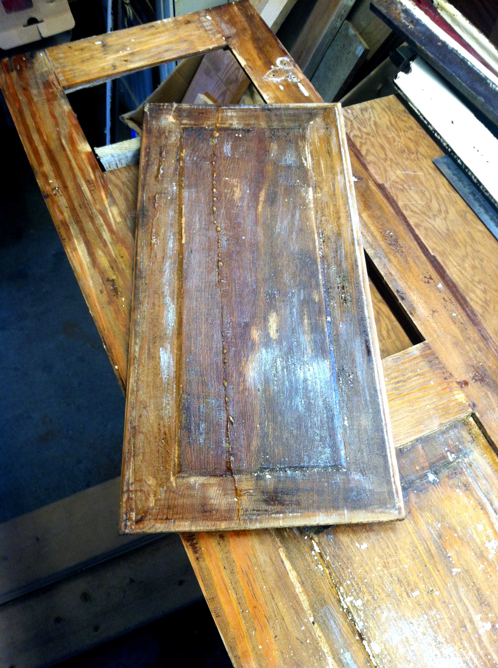 I was able to get the busted upper panel out pretty easily – the frame around it on the back of the door was split around the panel, probably when it was broken originally. I carefully scraped the paint off each of the 2 pieces first, I guess I was concerned that once the panel was glued back together there would be paint in the seam that I wouldn’t be able to get out. Once scraped, I glued & clamped the broken panel, and went to scraping the door.