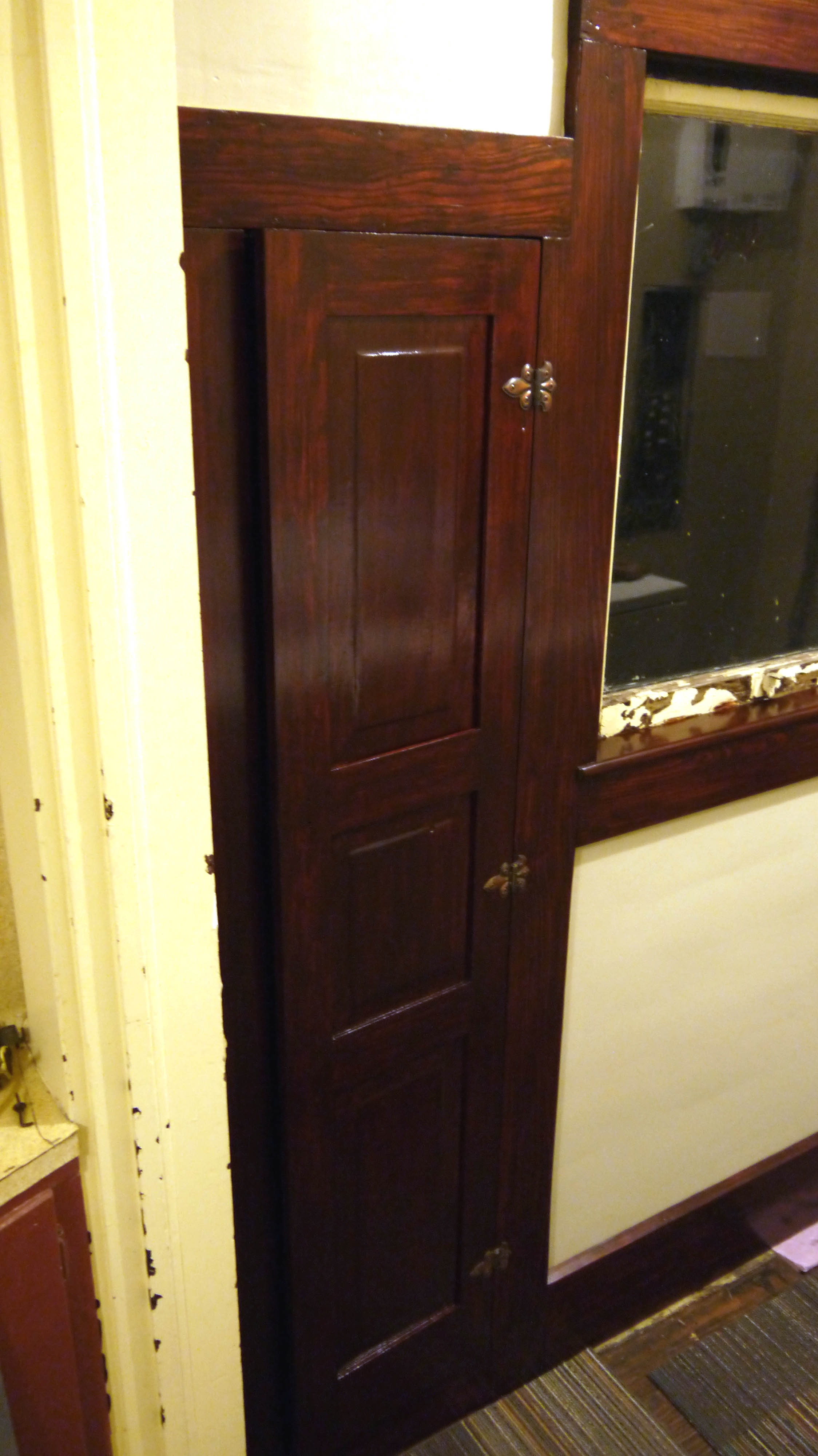 Although I went ahead and stained & poly’d most of the laundry room trim and baseboard, there were some small pieces of baseboard left that were lost – hiding – waiting in the garage. And the built-in broom closet had a busted panel in the door, so I removed it from the hinges and it was waiting in the garage also. Just like the woodwork had 50 layers of paint, so does all the hardware. The hinges are salvagable (although I destroyed the screws trying to scrape the paint off of them to back them out). The door latch was busted, but there are other examples in the house so I know what type to look for.