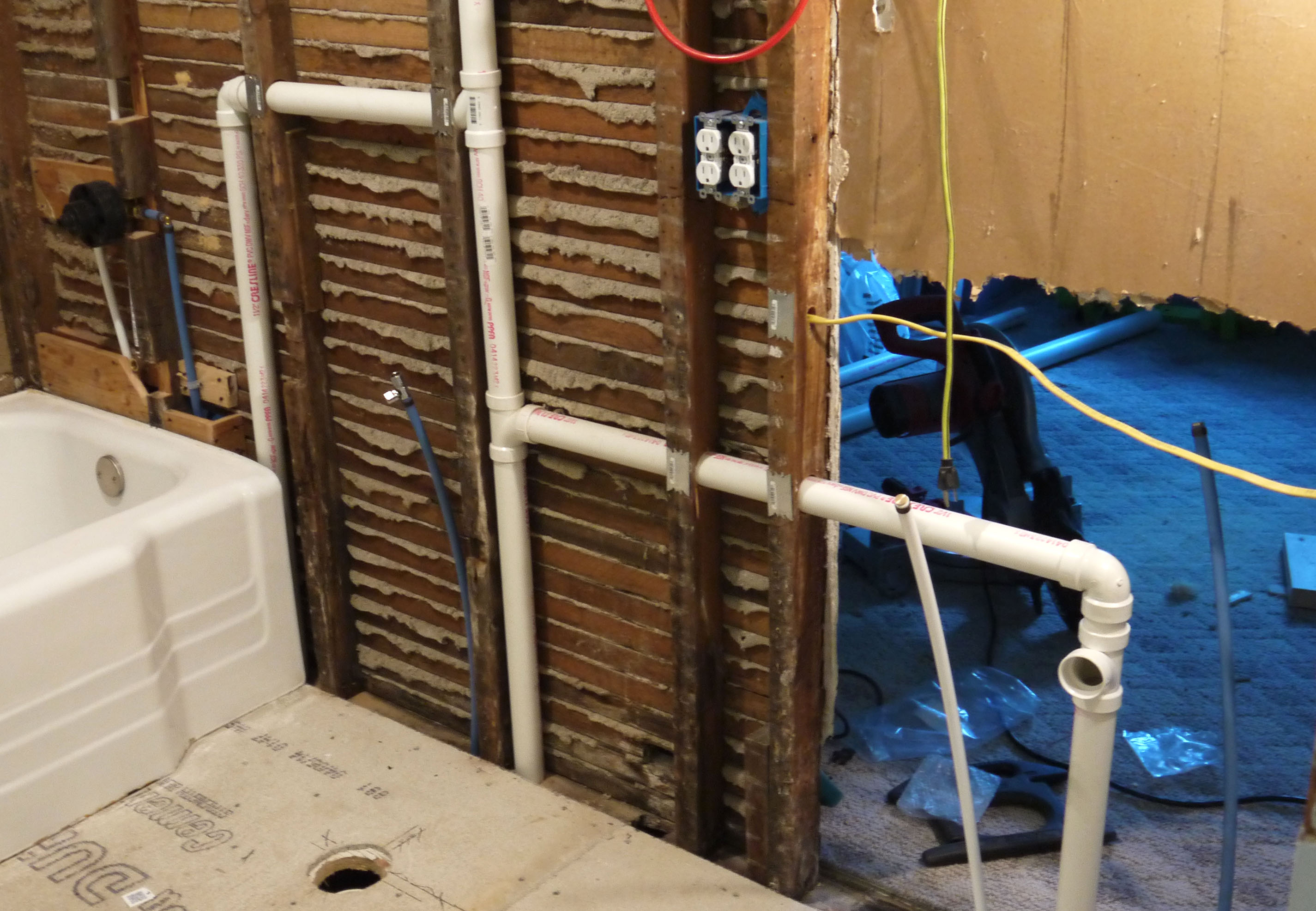 As in, I’m done with the PVC drains and vents! What a relief. I had most of the rough plumbing done a few weeks ago, enough to install the subfloor & underlayment, but I still had a few things unfinished. So over the past week I rough plumbed for the tub faucet, shower head, and shower mixer valve.