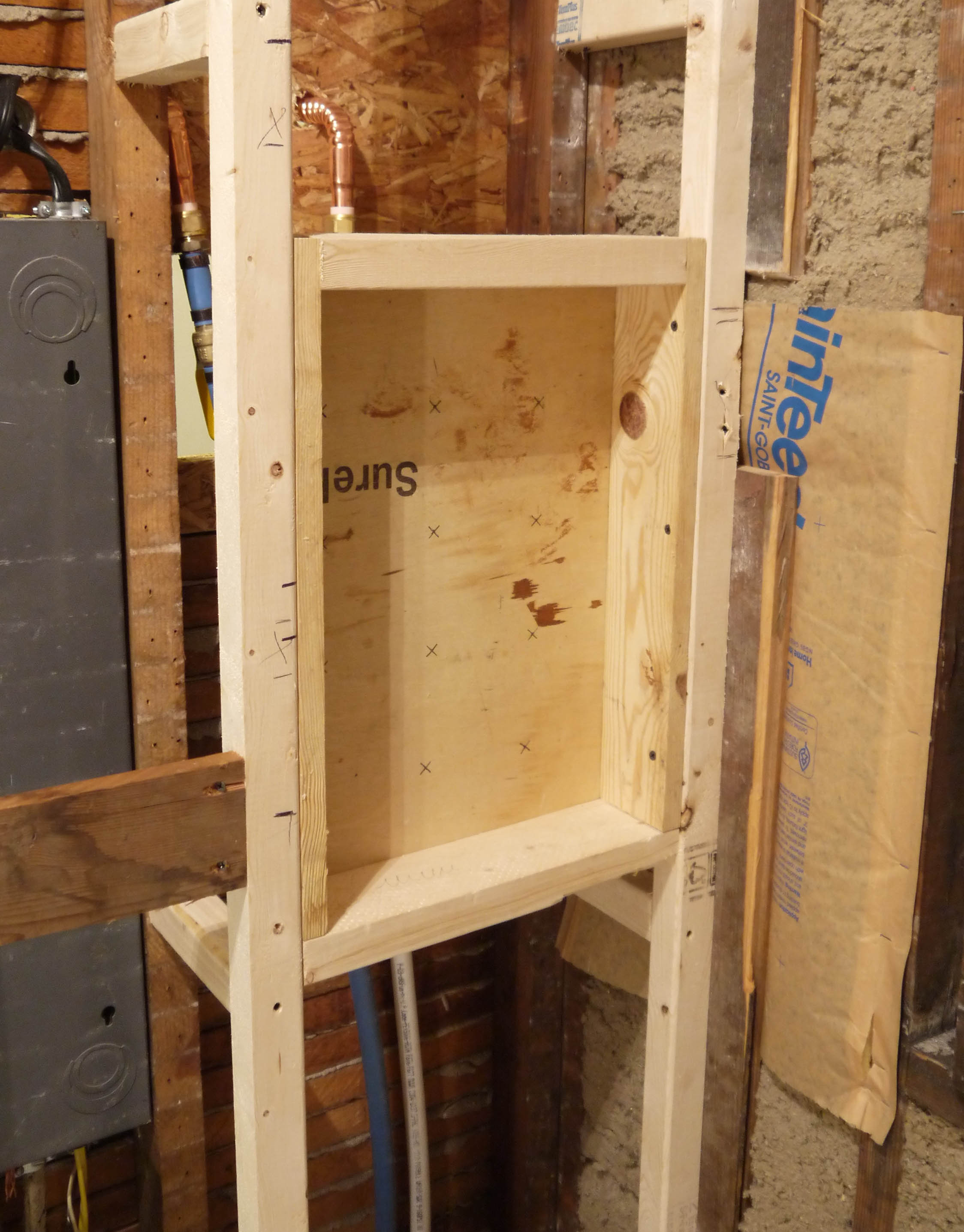 This is what I’m super excited about. It’s my shower soap & shampoo niche. I’m not a big fan of these old metal shower soap trays (although they are very appropriate for the time period look I’m going for – pretty sure I tore 1 or 2 out in the beginning). Instead, I wanted a built in niche, so I basically built a window frame and secured it into this wall space. It will get covered in cement board just like the shower walls, then tiled to look seamless like this: