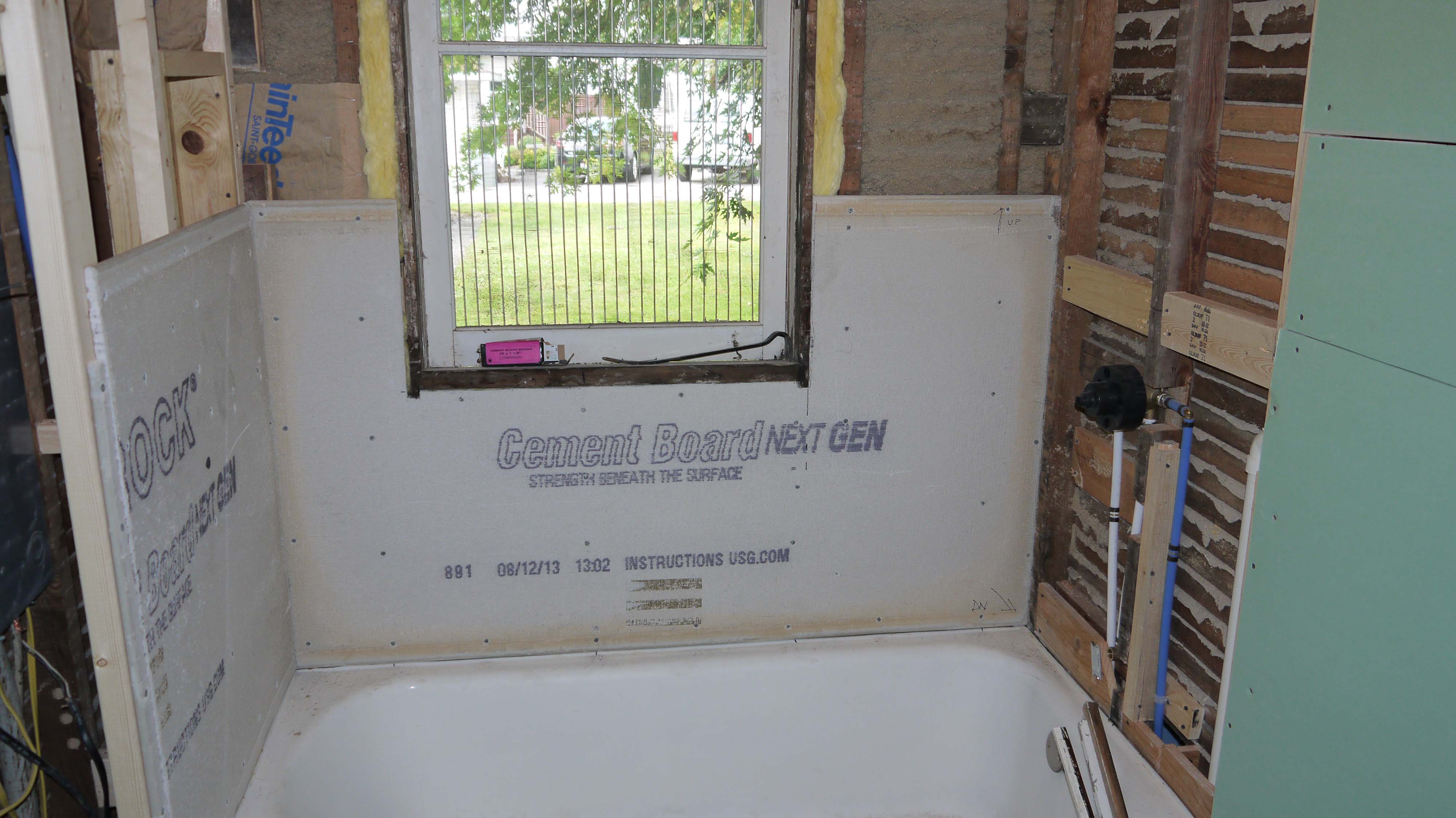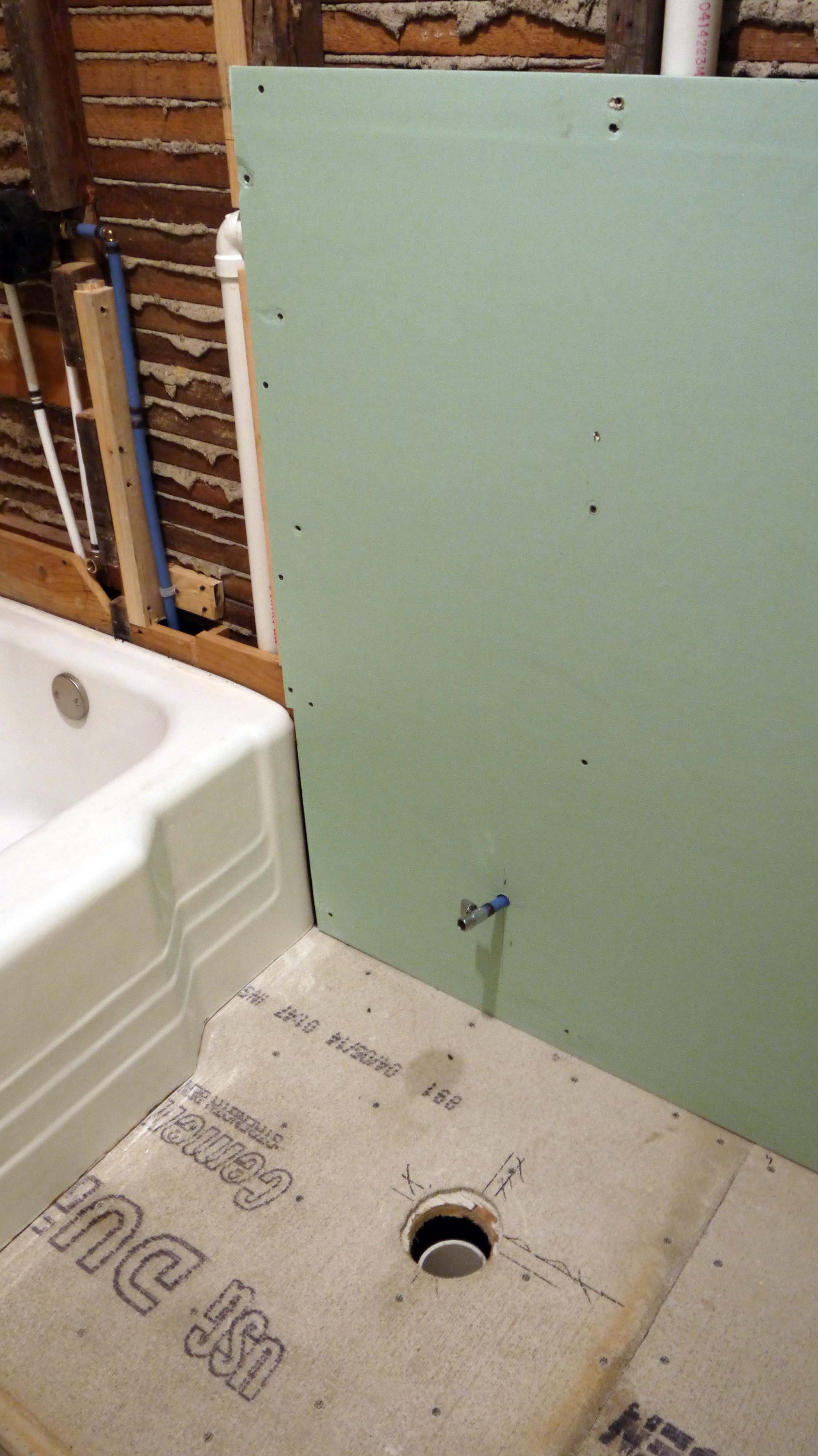 Cutting the cement board is not as easy as cutting drywall. Instead of scoring with a utility knife and snapping it apart, I used a metal cutting blade in my handheld jigsaw. It did a little tearing out along my cut line line (after all, there are pieces of aggregate compressed into the board just like in cement), but it’s a raw edge so that’s ok. I didn’t have any trouble drilling holes for the tub and shower faucet or the mixer valve. I just used the matching size hole saw bit and it went through just fine. For attaching the cement board, the lumberyard sold me special ‘cement board’ screws that are recommended. They have different threads than drywall screws and a larger head, which prevents them from pulling through the surface too far. They barely countersink themselves and that holds the cement board tightly against the wall studs. Same as the floor, the shower walls are super string and rigid, and just about ready for tile!