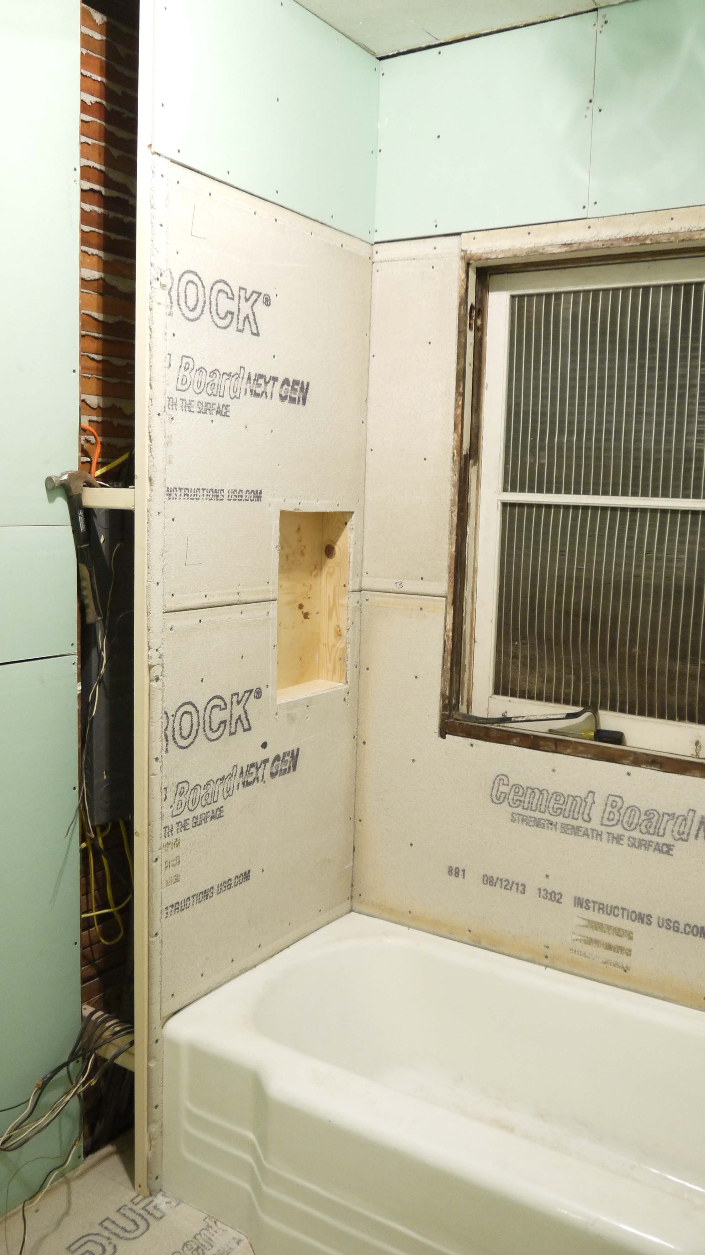 I’m not sure if I had to, but I went ahead and taped the seam between the drywall and cement board along the shower walls. I haven’t fully made up my mind about how tall the tile in the shower will go. I’ve seen some examples where they tile clear up to the ceiling: