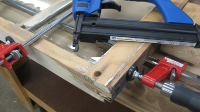 But I use exterior wood glue and epoxy pretty liberally to make sure the joints are secure and the sash will last another century. In the sash above, I nailed 2 small brads to hold the joint along with the clamps, and then drilled a hole 3/4 of the way deep and glued a wood dowel into place. I haven’t yet had to do a “dutchman repair,” but there’s are several great online tutorials in case I find a spot rotted so badly that epoxy won’t cut it.