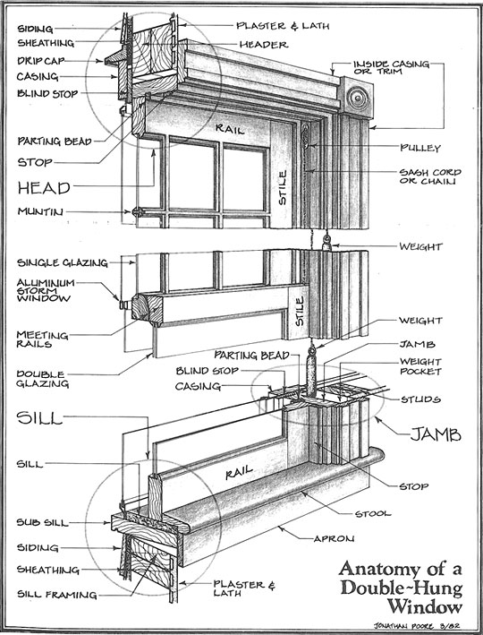 I’ll begin with an illustration that names the basic parts of a wood double hung window. This way I can document my process using the proper names for each piece, rather than my descripty thingy words I’m known for inventing. (Wordsmithing is a skill, after all.)